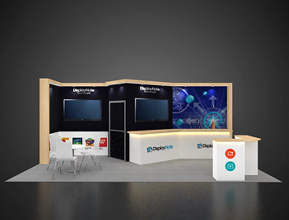 This 10x20 exhibit features a wrap-around back wall, two built-in counters, and dual large display screens. It incorporates a private meeting area with modern furniture, elevated wood-look fascia, and a high-contrast black and white color scheme.