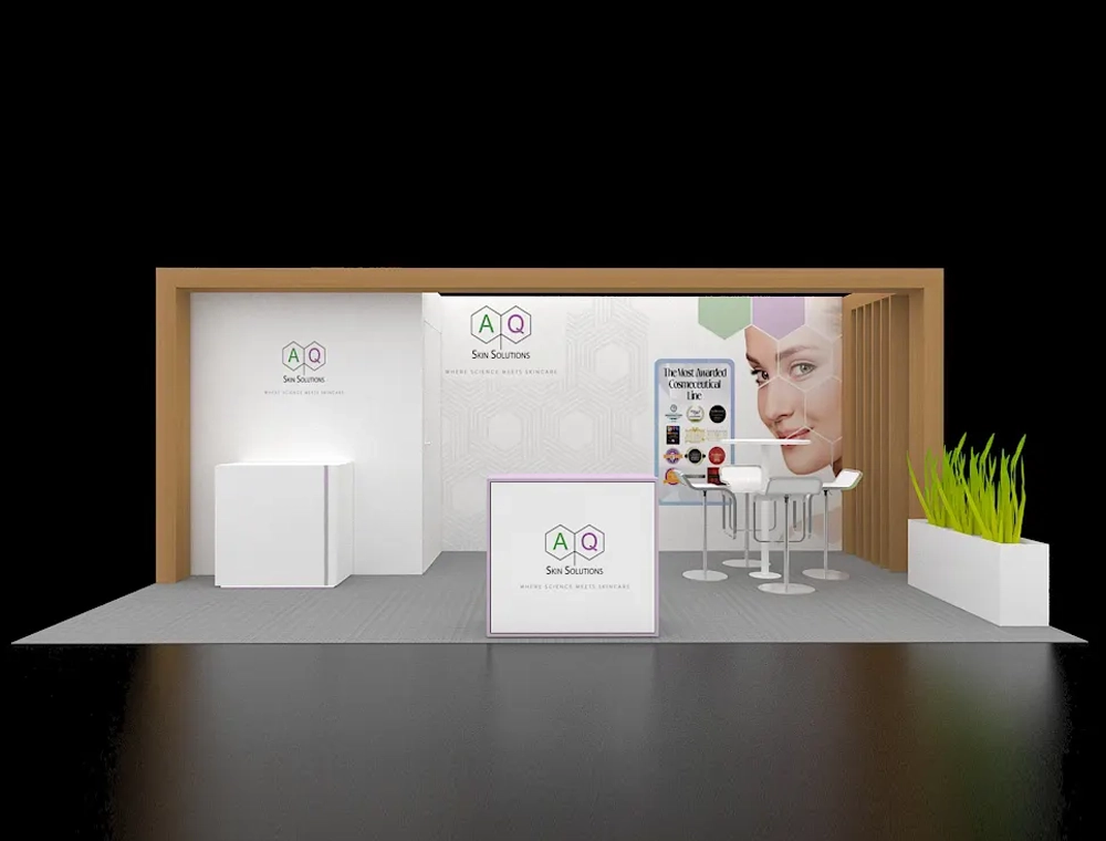 This 10x20 AQ Skin Solutions booth offers a serene and inviting atmosphere. It features a striking blonde wood architectural frame, leading to a comfortable café-style seating area. A prominent graphic of a model's face and product display highlights the brand. The layout seamlessly blends natural textures with clean white surfaces, completed by a central reception for visitor engagement.