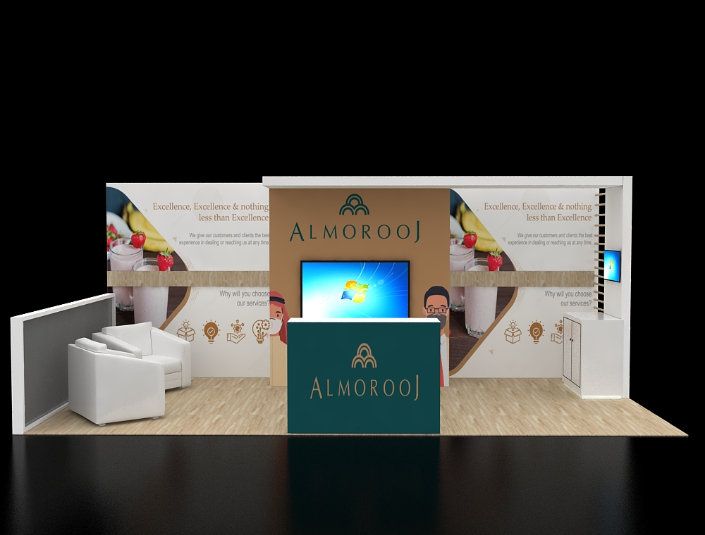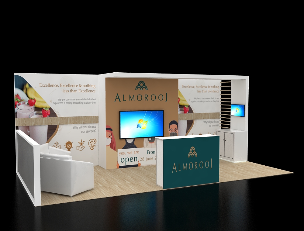 This 10x20 exhibit is defined by two separate media stations, each featuring a monitor and a storage cabinet. A spacious central lounge area includes a round table and four comfortable white chairs. The design is framed by angled fluted side walls and anchored by a branded reception counter at the front.