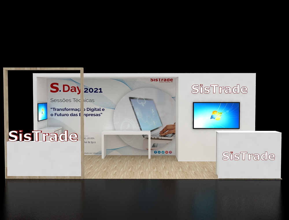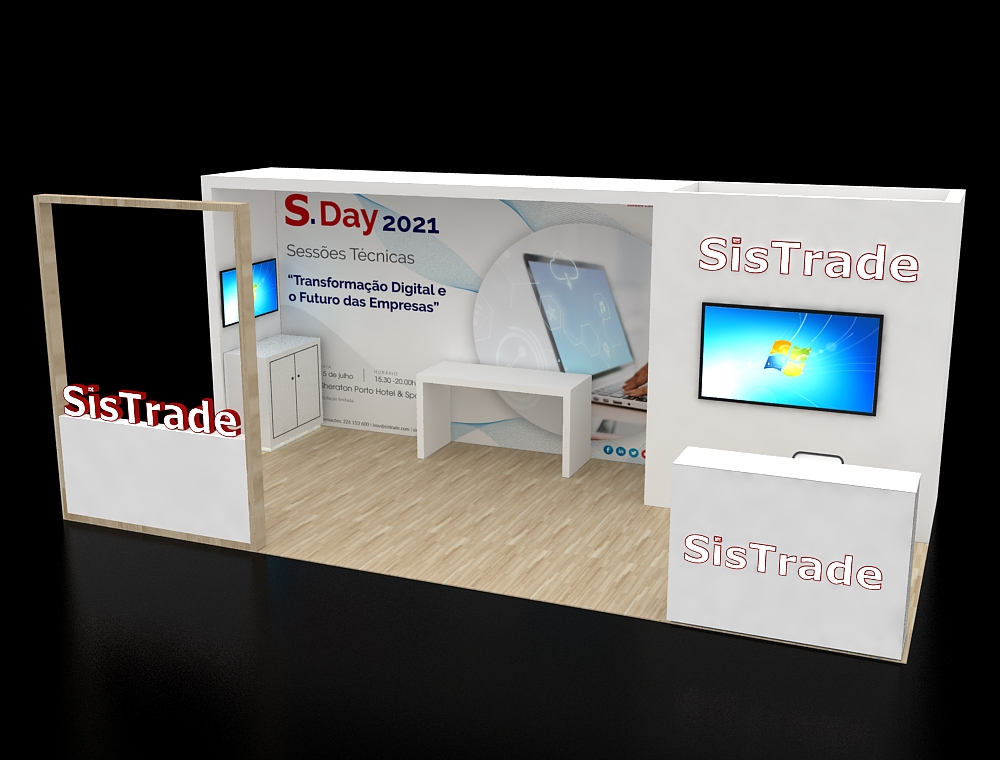 This 10x20 trade show display is characterized by a wood-look corner frame that highlights a wall-mounted monitor above a storage cabinet. The central area features a small round table and two chairs for casual client discussions. The exhibit is completed by a clean graphic back wall and a freestanding branded reception counter.