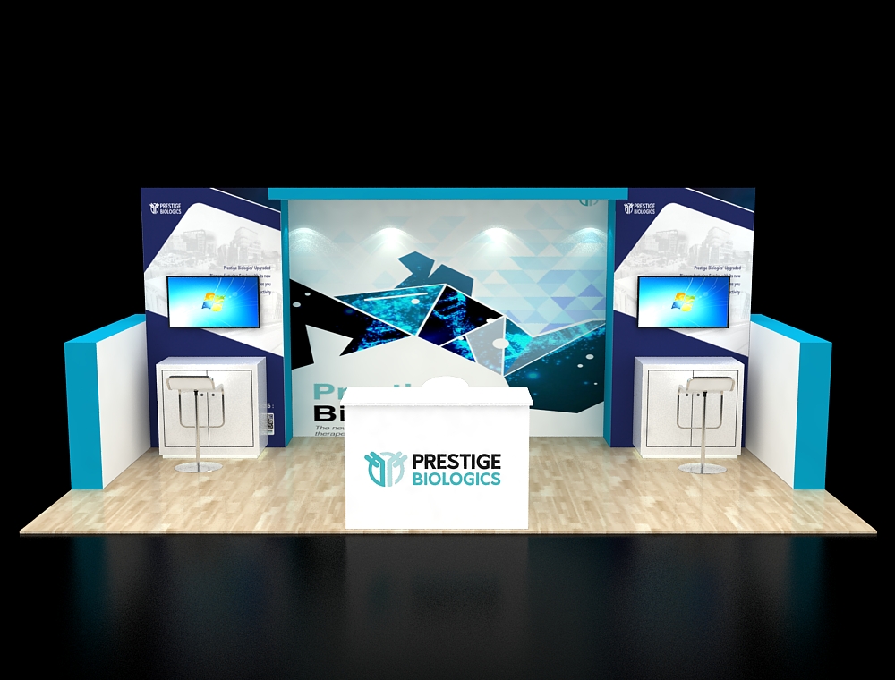 A large, continuous graphic backwall provides the visual focus for this 10x20 exhibit. The open floor plan highlights a central white lounge seating cluster with a glass table for client meetings. The display is defined by a light gray wood floor effect and anchored by a low-profile reception counter near the entrance.