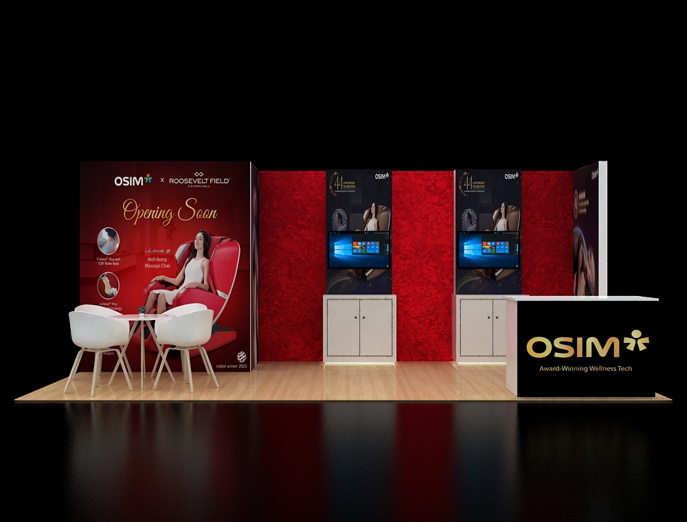 A full-width graphic wall characterizes this 10x20 exhibit, which features multiple integrated video displays and locking storage cabinets. A central seating area with a round table and four white chairs provides a comfortable lounge feel. The entire space is grounded by a light wood-effect floor and includes a prominent reception counter near the entrance.