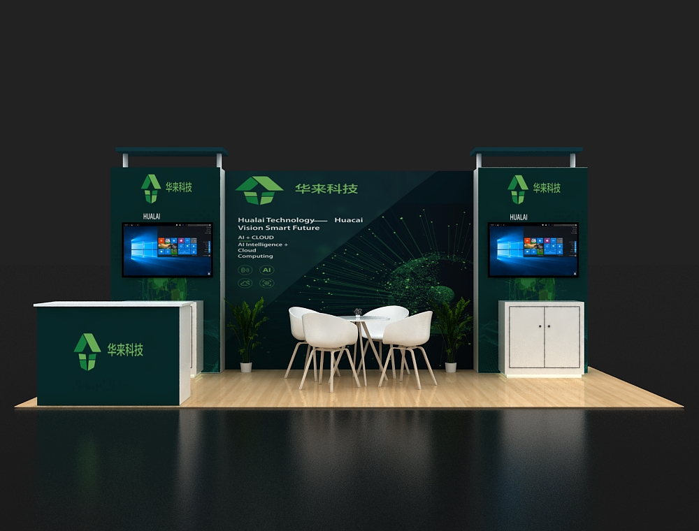 This 10x20 exhibit is structured around two prominent branded pylons with integrated monitors and storage cabinets, defining a central meeting space. The area features a round table and four white chairs. The display utilizes a dark green graphic backdrop with a subtle geometric design, all resting on a light wood-grain floor and anchored by a side reception desk.
