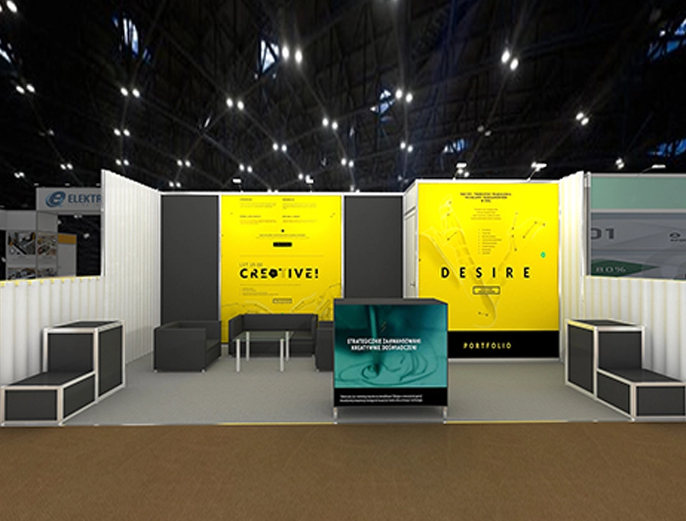 This 10x20 modular display features a large, continuous graphic backdrop dominated by a world map graphic, setting a strong visual presence. The layout maximizes visitor capacity by utilizing three separate round-table seating areas. The design includes a prominent illuminated counter and a hidden, lockable storage closet in the back corner.