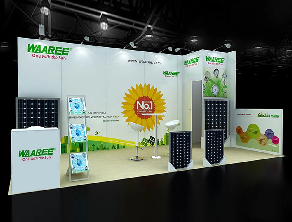 This 10x20 display features a striking raised wood-effect platform and a central wooden archway. The layout includes a dedicated area for model display, a full-sized digital screen, a bar-height counter, and low, comfortable lounge seating, efficiently combining demonstration and consultation zones within the space.