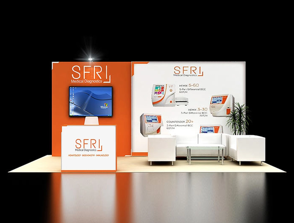 This 10x20 modular display features a high-impact red and white color scheme across multiple graphic segments, including angled side walls. The stand integrates two private round-table consultation areas, a prominent central counter, and a lockable storage room, optimizing the space for both meetings and secure storage.