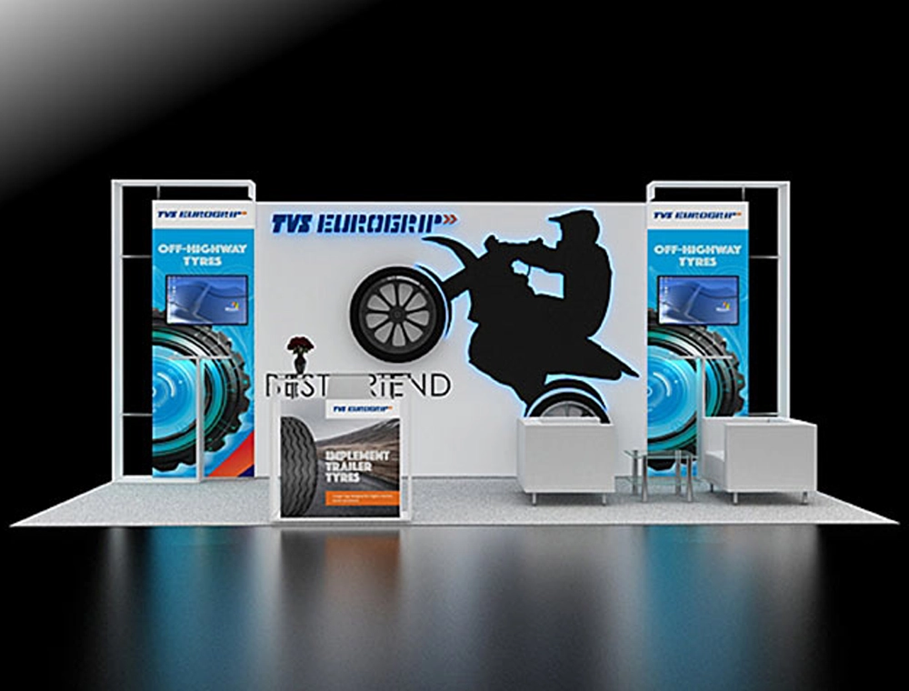 This 10x20 modular stand is characterized by two illuminated side display pillars that frame a large central graphic. The layout incorporates a modern, low-profile lounge seating area and a central reception desk with integrated storage. A light-toned carpet provides a clean foundation for the high-impact visual elements.