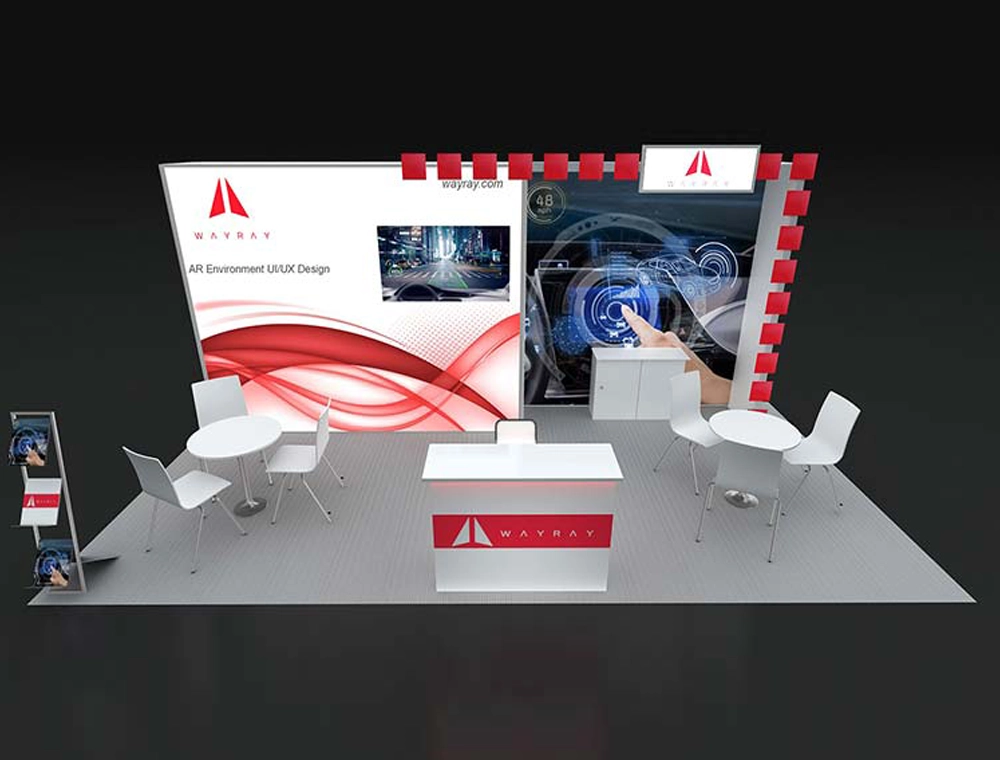 This 10x20 exhibition stand effectively combines presentation and consultation spaces. It features a prominent digital display integrated into a distinct rear segment, flanked by a large graphic wall. The centrally positioned illuminated counter and two round-table seating areas optimize visitor flow and facilitate focused demonstrations and discussions.