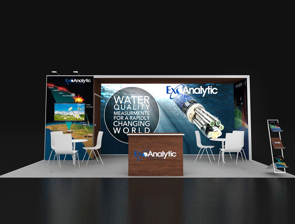 This 10x20 modular exhibit features a dramatic large-format graphic backwall and a functional design. It includes two casual consultation areas with round tables, a central wooden reception counter, and an integrated multimedia display monitor. A freestanding literature rack and dedicated private storage maximize organizational efficiency and visitor engagement.