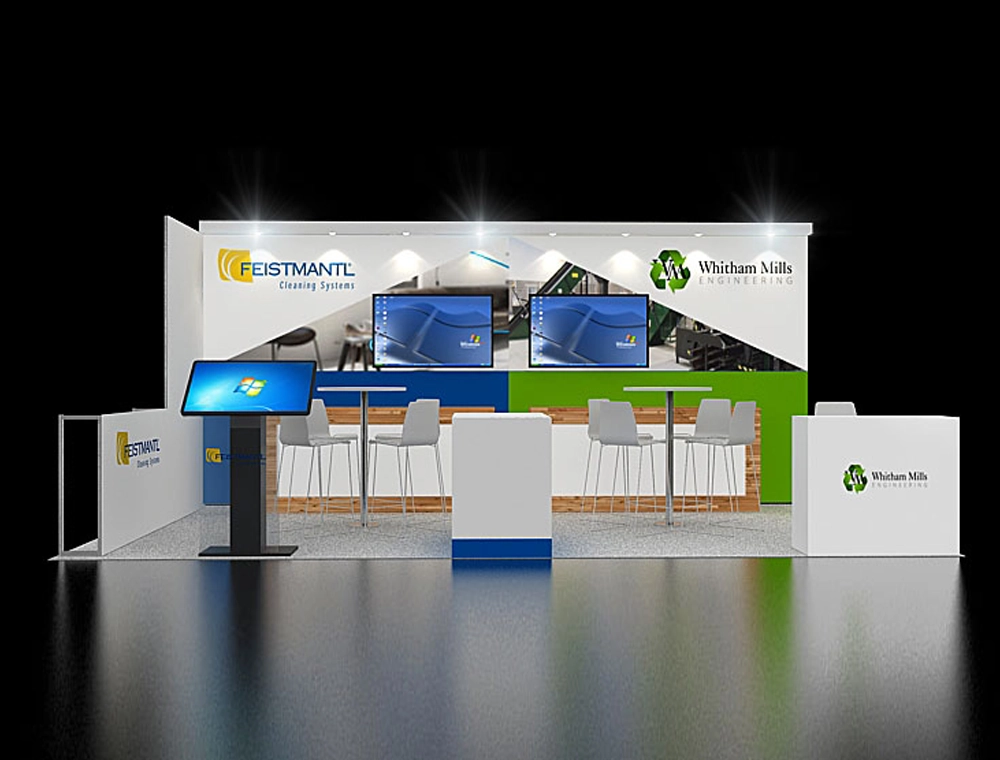 This 10x20 modular exhibit features a vibrant multi-color backwall. It includes two large integrated monitors for presentations and two casual discussion tables with chairs. A prominent freestanding interactive kiosk engages visitors, while a central branded reception podium offers a professional welcome. The design efficiently utilizes space for both display and interaction.