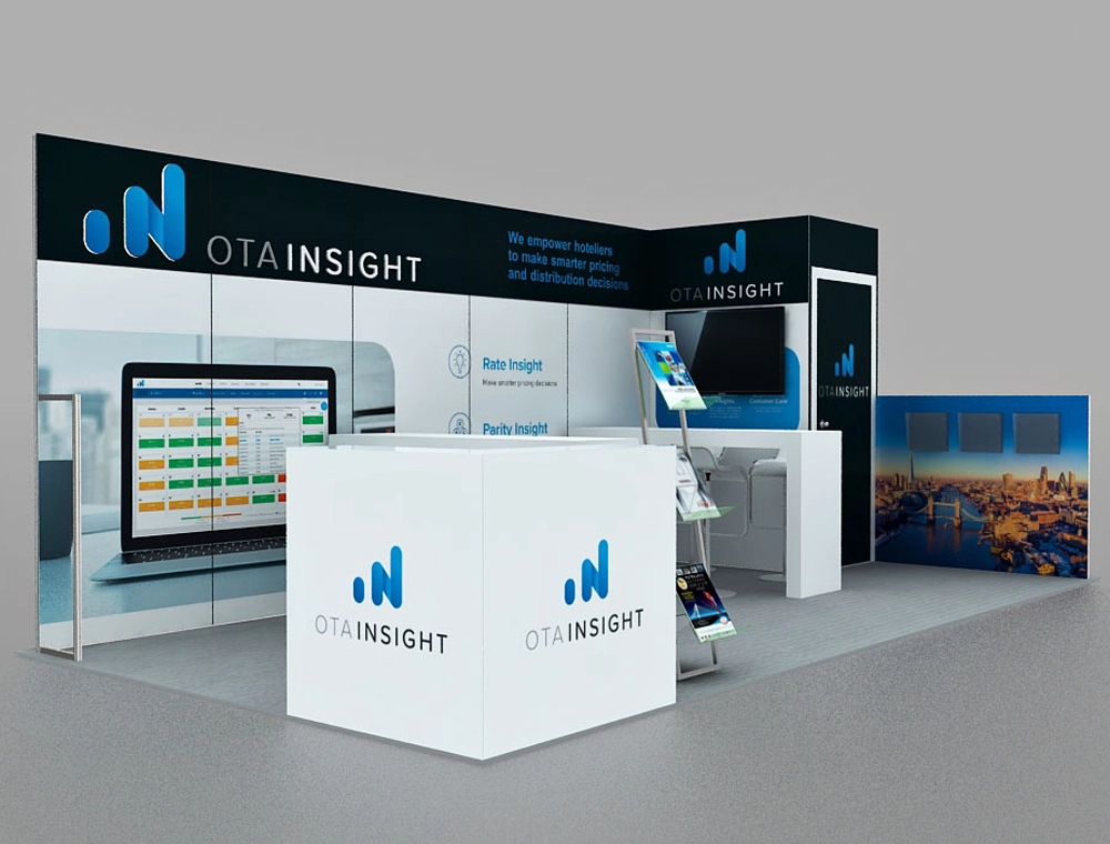 This 10x20 corner exhibit features two long high-top demonstration tables with stools, maximizing engagement space. A large integrated monitor and clear bullet-point graphics showcase information effectively. The design includes an L-shaped reception counter, a literature display rack, and a discreet lockable storage room, optimizing both presentation and functionality.