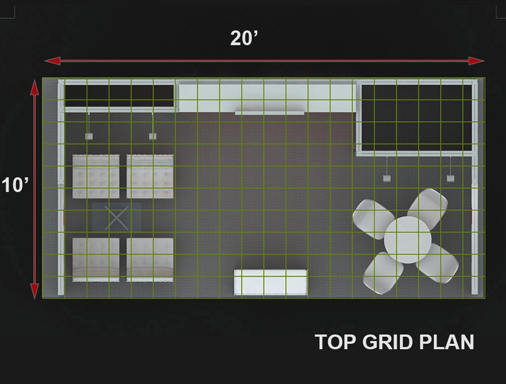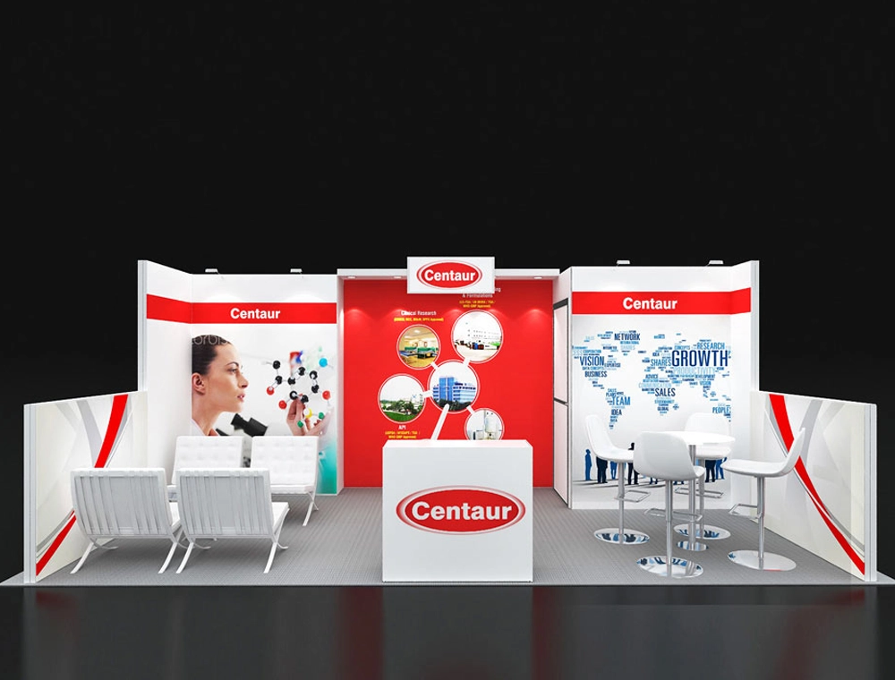 This 10x20 island exhibit features a multi-zone layout for diverse interactions. It offers a comfortable lounge seating area and a separate high-top discussion table. A vibrant red graphic backwall with integrated visuals anchors the space, complemented by a central reception counter and clear, eye-catching visual messaging for maximum engagement.