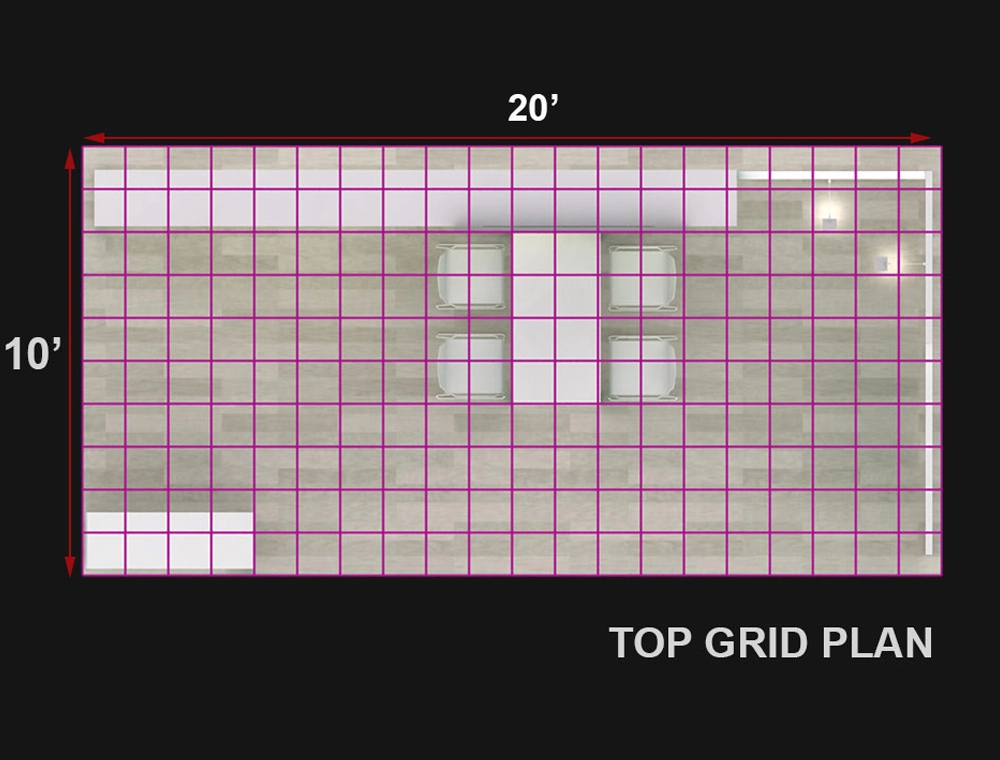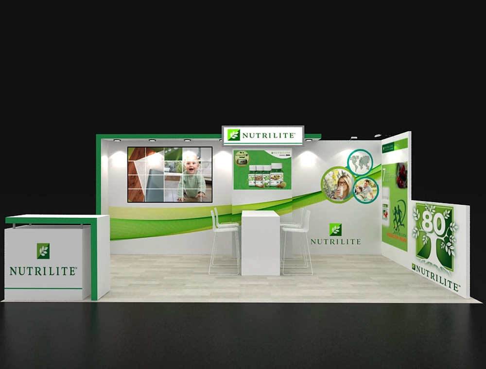 This 10x20 modular exhibit presents an inviting, open design. It features a prominent large-format video wall for dynamic content and a central high-top interaction table with stools. Multiple integrated shelving units and overhead illuminated signage showcase products effectively, all framed by a fresh, vibrant green and white color scheme.