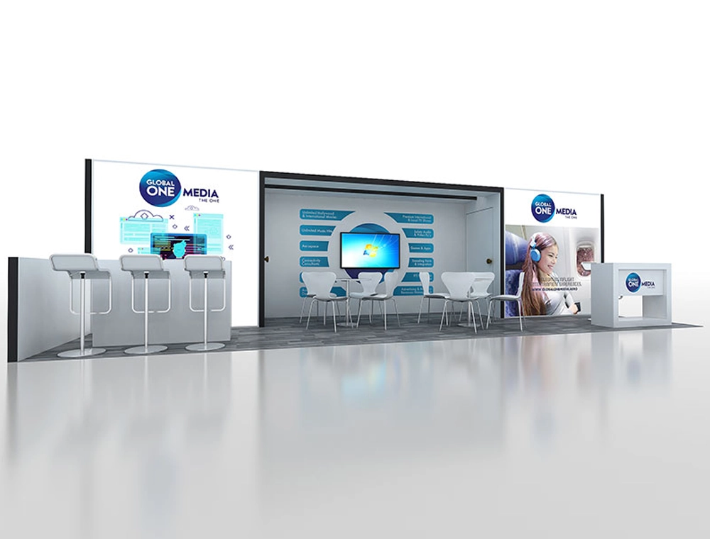 This 10x30 inline display features a central enclosed presentation area with a media screen. It includes dual-sided engagement zones: a high-top bar with seating on the left and a branded counter with a large format graphic on the right. The structure integrates a private meeting space and multiple branding panels.