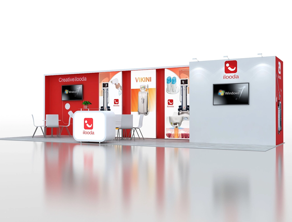 This set includes four diverse 10x30 booth designs. Features range from a central full-height graphic wall with a counter and seating, to designs incorporating dual monitors, and layouts with multiple meeting clusters or display pods. All concepts utilize clean perimeter walls for maximum branding impact.