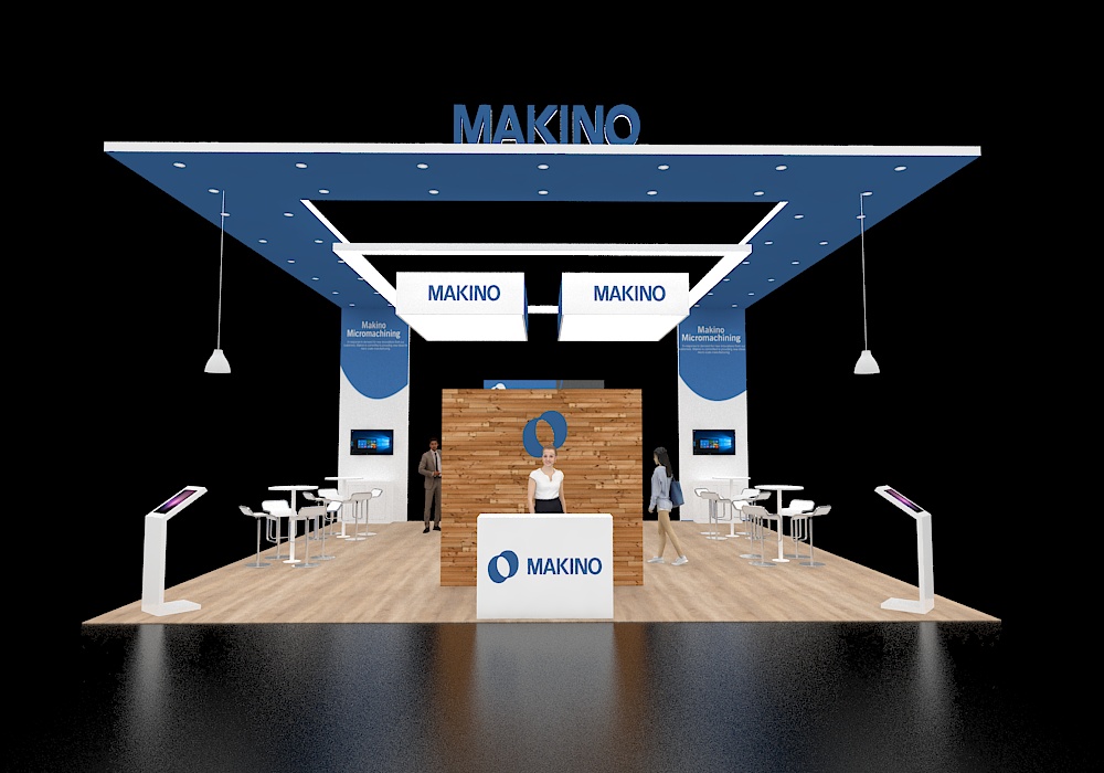 This 20x20 island exhibit features a large central storage column with a mounted media screen and curved graphic accents. Twin arched headers extend from the center, creating two distinct high-top seating areas with round tables and stools. The booth is completed by a front low reception counter and uses a gray carpet floor.