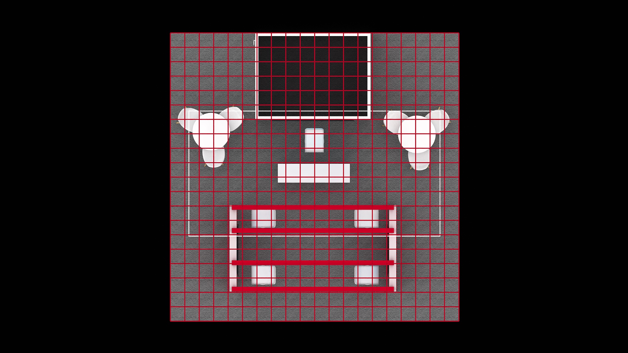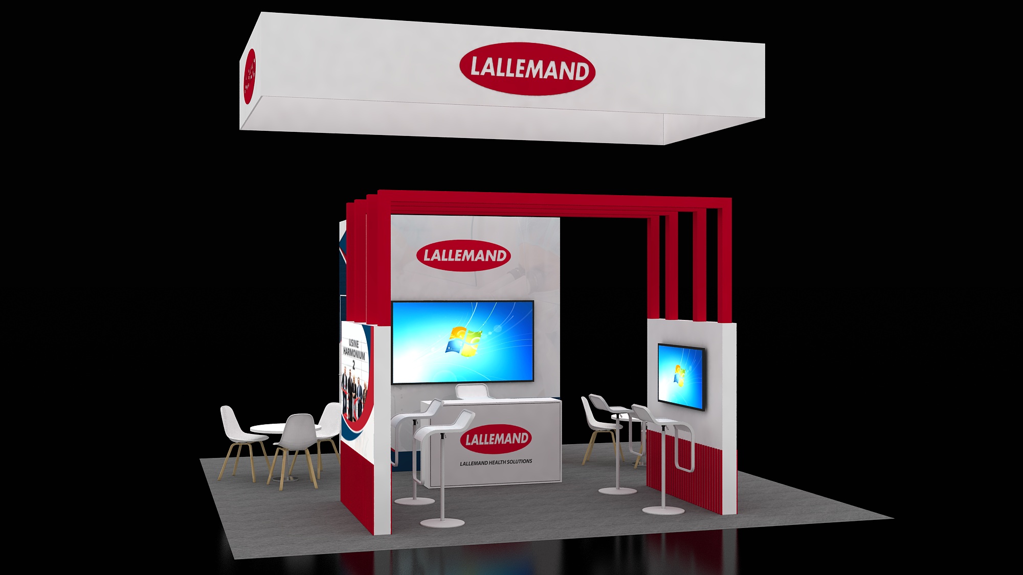 This 20x20 stand features a large central curved back wall with two integrated display monitors and low storage cabinets. A prominent blue circular floor graphic anchors a central reception counter and a four-person seating area. The booth design incorporates a large circular overhead hanging sign and a mix of wood-look and blue vinyl flooring.