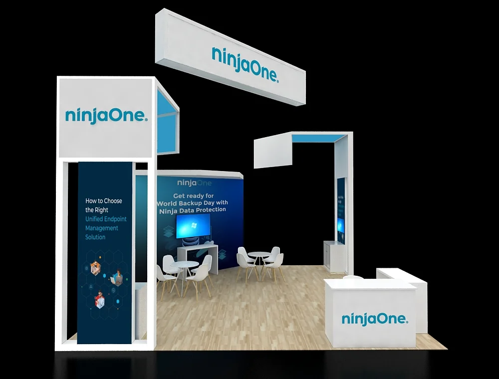 This 20x20 open-design exhibit features two prominent vertical arch structures flanking a central rear graphic wall. Key features include a large overhead rectangular banner, a flush-mounted video screen, a reception counter, and small consultation tables with chairs, all on a light wood-effect floor.