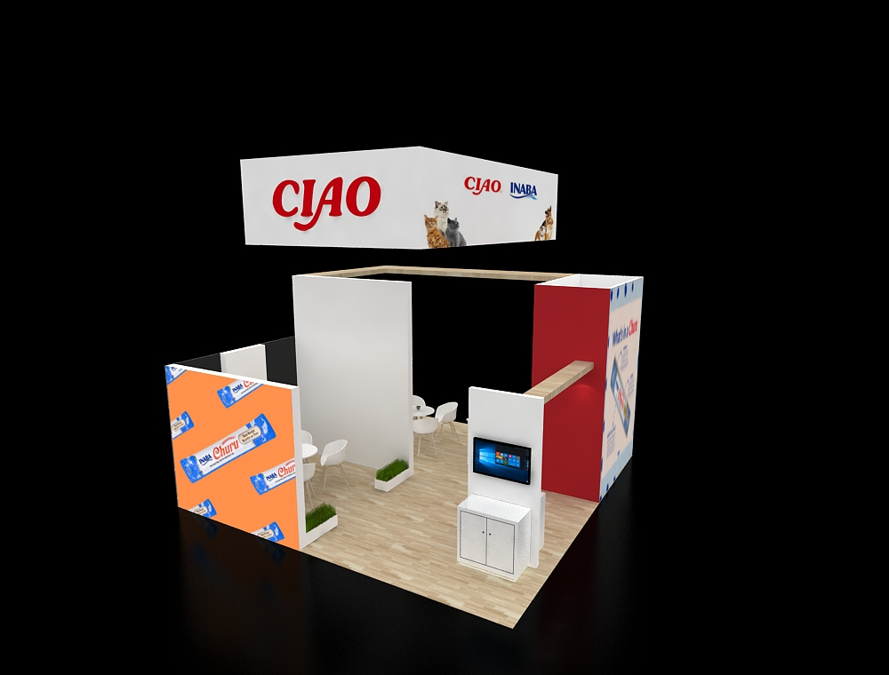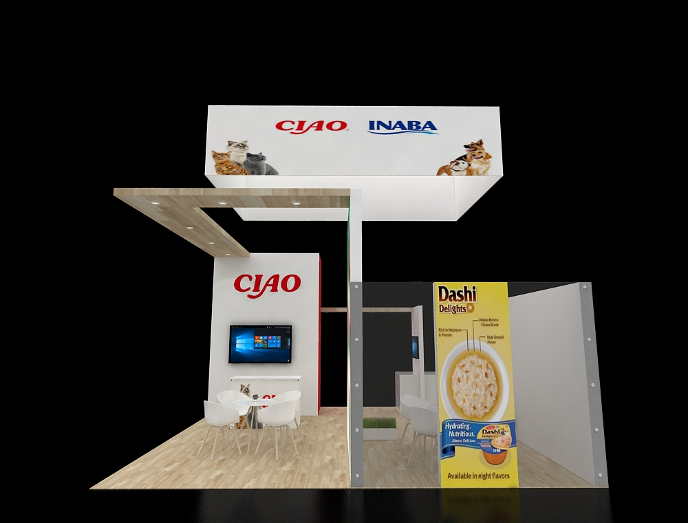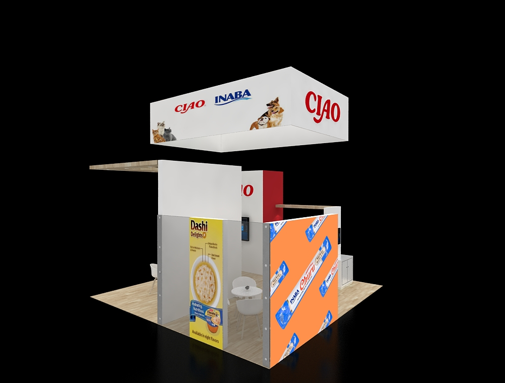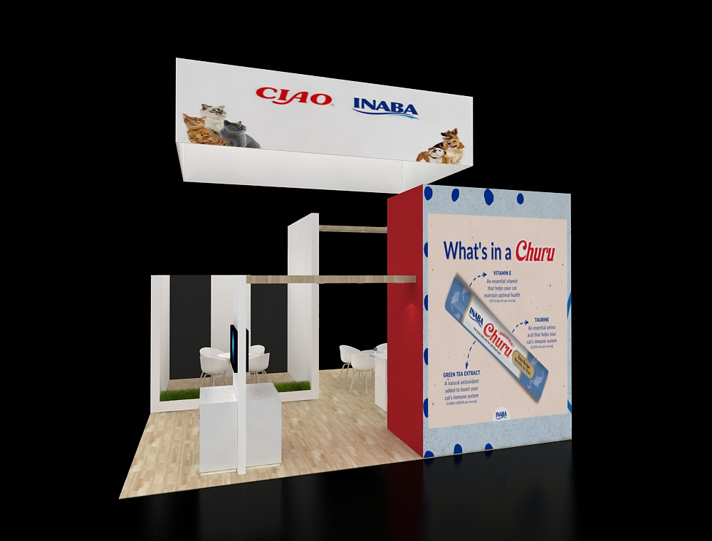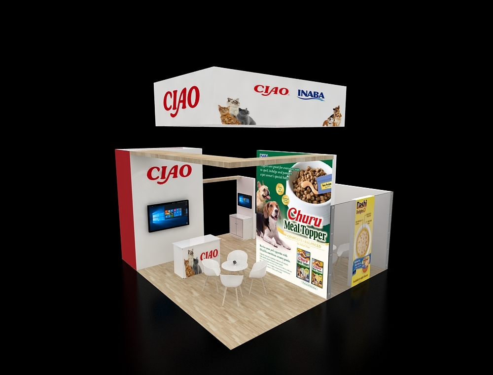 This 20x20 trade show display features a spacious, open floor plan and striking high-contrast graphics. Key elements include an upper overhead banner and distinct wall signage. The layout incorporates a dedicated viewing screen, hospitality seating, and a corner product highlight area, all within a linear architectural frame.