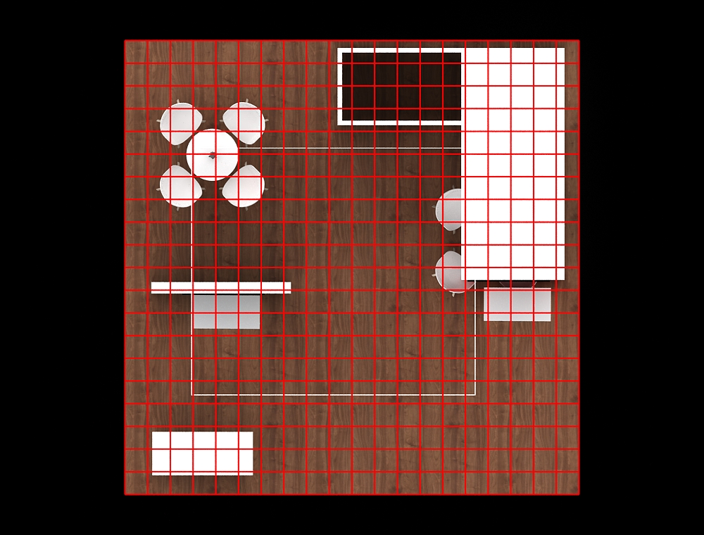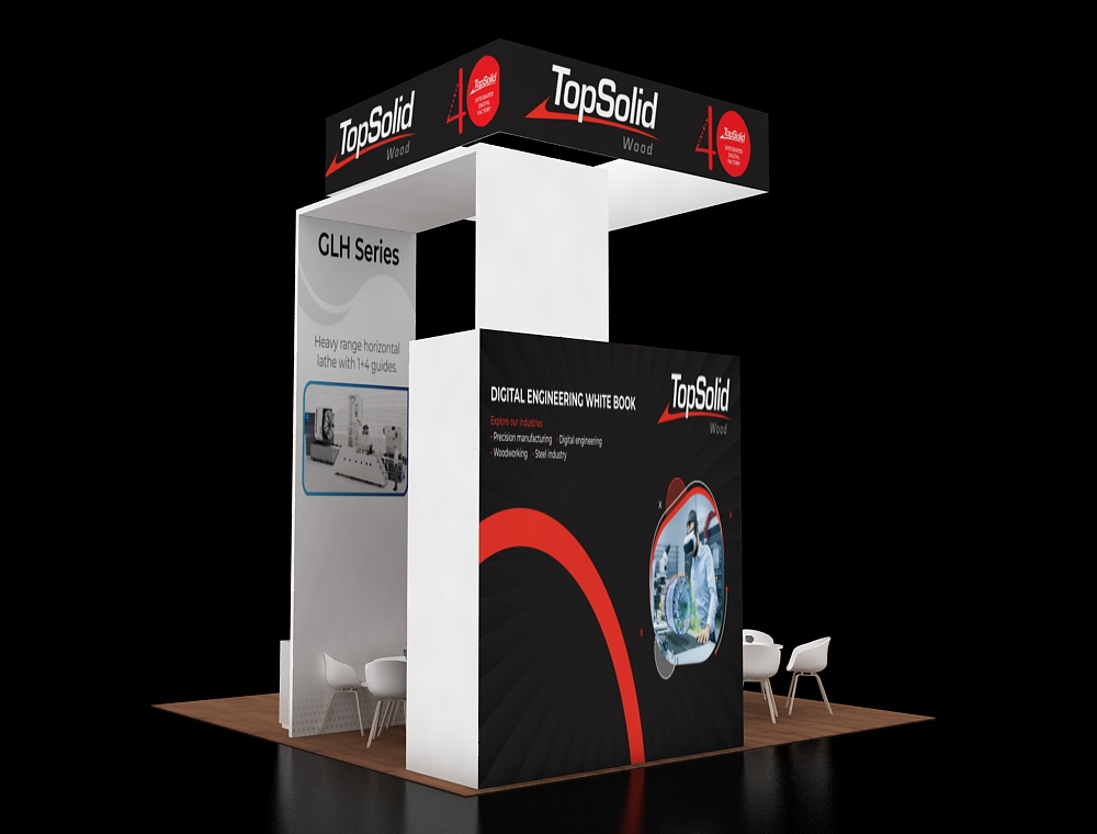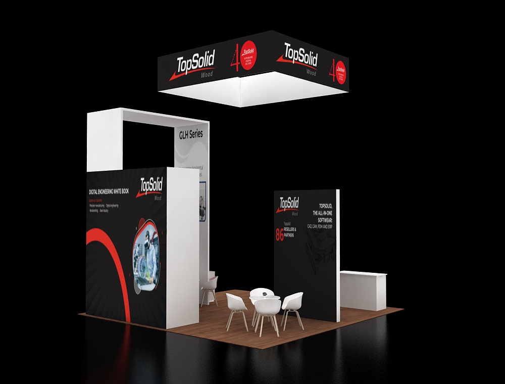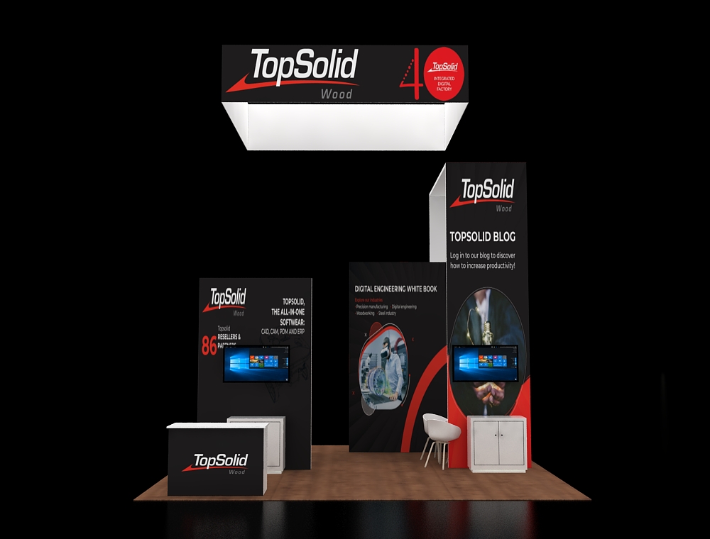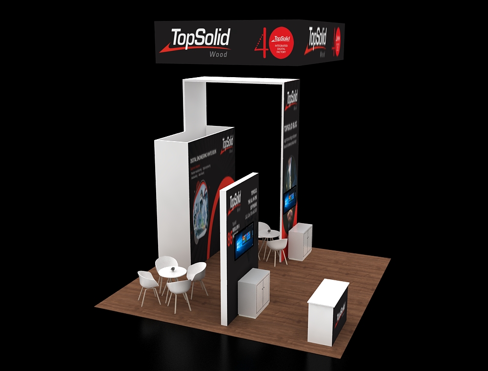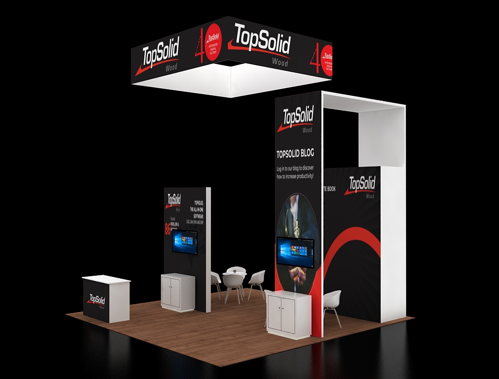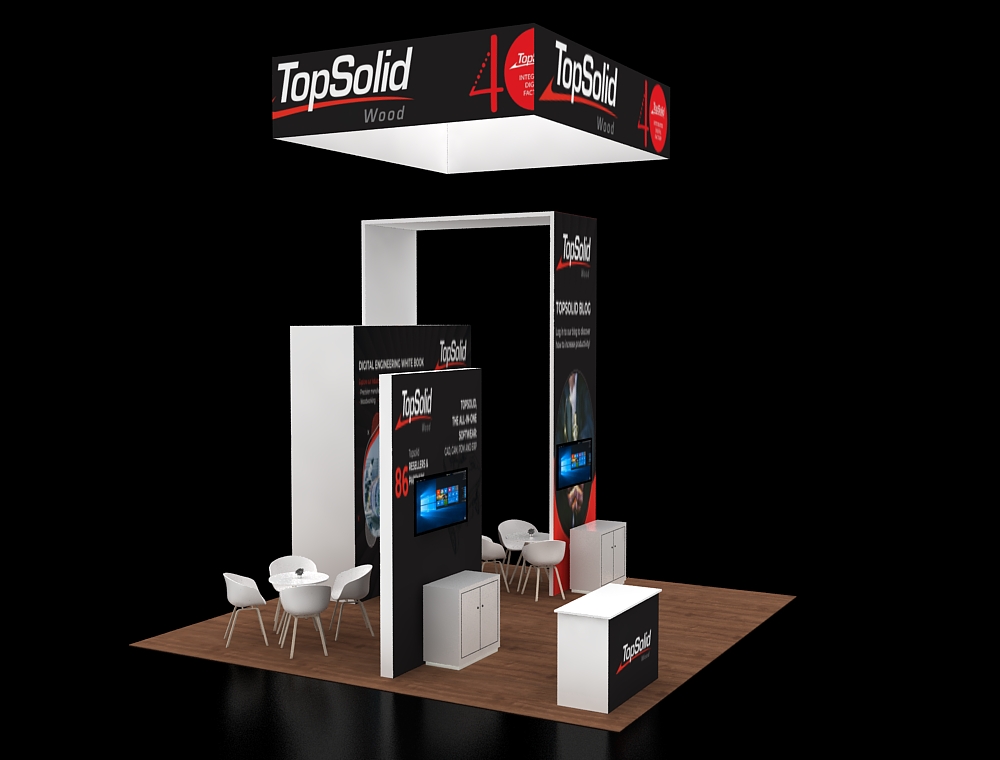 This 20x20 booth features a prominent central arch structure, creating an inviting internal consultation area. It includes a recessed ceiling light within the arch and four surrounding white storage/display cabinets. The design integrates a monitor for digital presentations, full-height graphic panels, and a dedicated meeting area with a table and chairs, all on a wood-look floor.