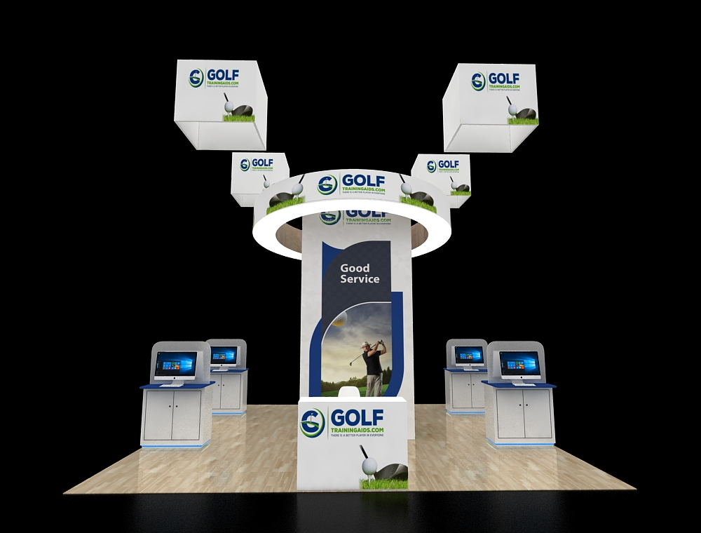 This 20x20 exhibit features a large, highly branded backwall graphic and an open seating arrangement. It includes a corner video monitor station with storage, a dedicated reception counter, and a prominent overhead hanging sign with a light blue interior accent, creating an inviting, airy space.