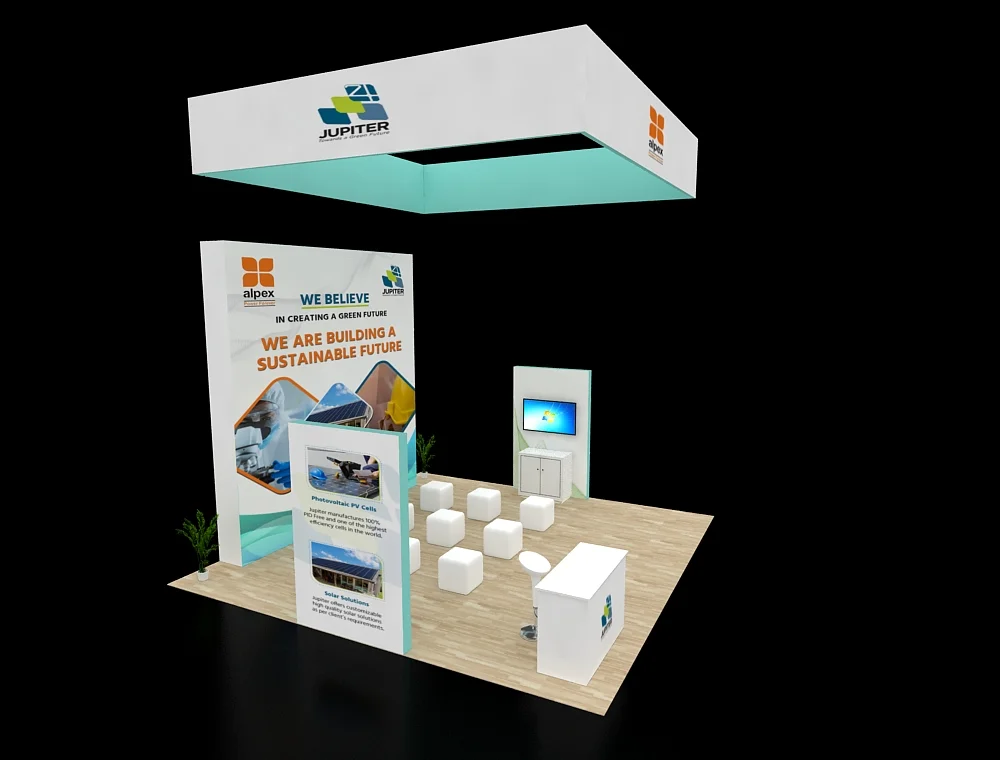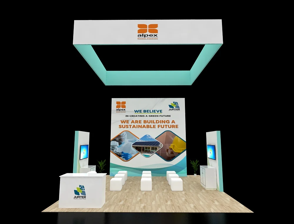 This 20x20 exhibit features a large central graphic panel and two integrated video monitors on flanking display towers. It includes a rectangular overhead sign, a front reception counter, and eight modular white cube seats, offering a balanced layout for presentation and informal meetings.