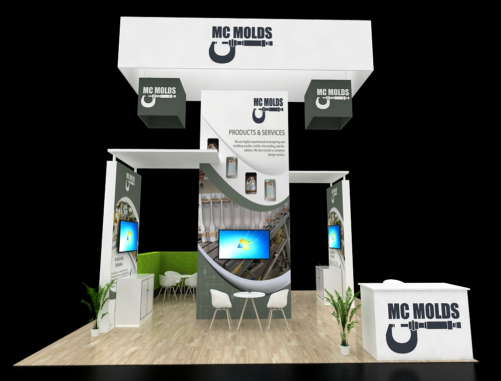 This 20x20 island exhibit features a dominant, four-sided overhead structure and four corner video display towers. It includes a central seating area, an L-shaped reception counter, and extensive light blue graphic paneling, providing maximum corner visibility and multiple engagement points.