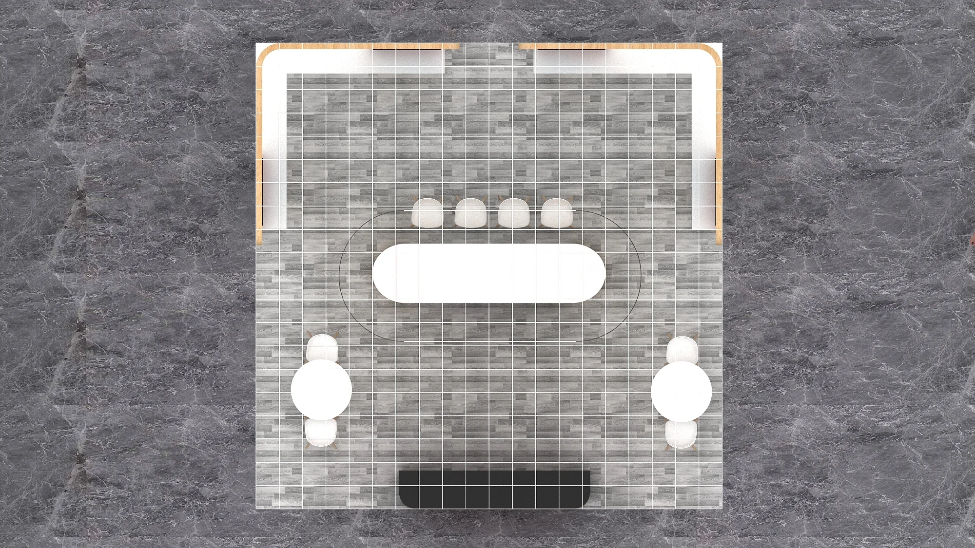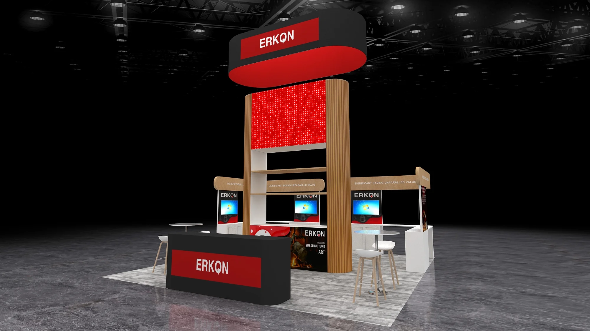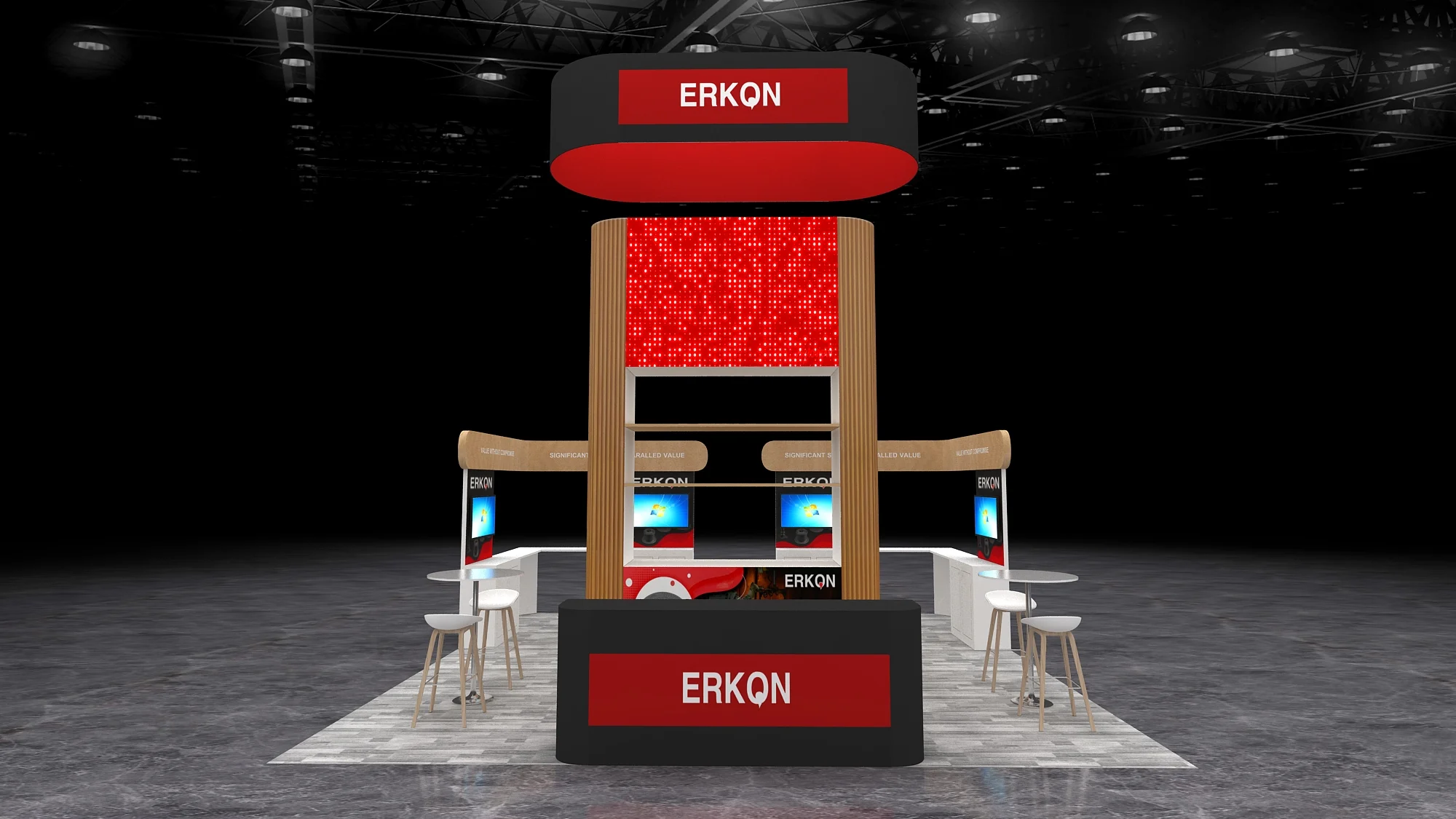 This 20x20 inline display features a central square column with an integrated media screen. Two curved overhead arches extend from the center, creating dual seating zones with small round tables and high-top stools. A low reception counter stands in the foreground, complementing the circular graphic accents and open layout.