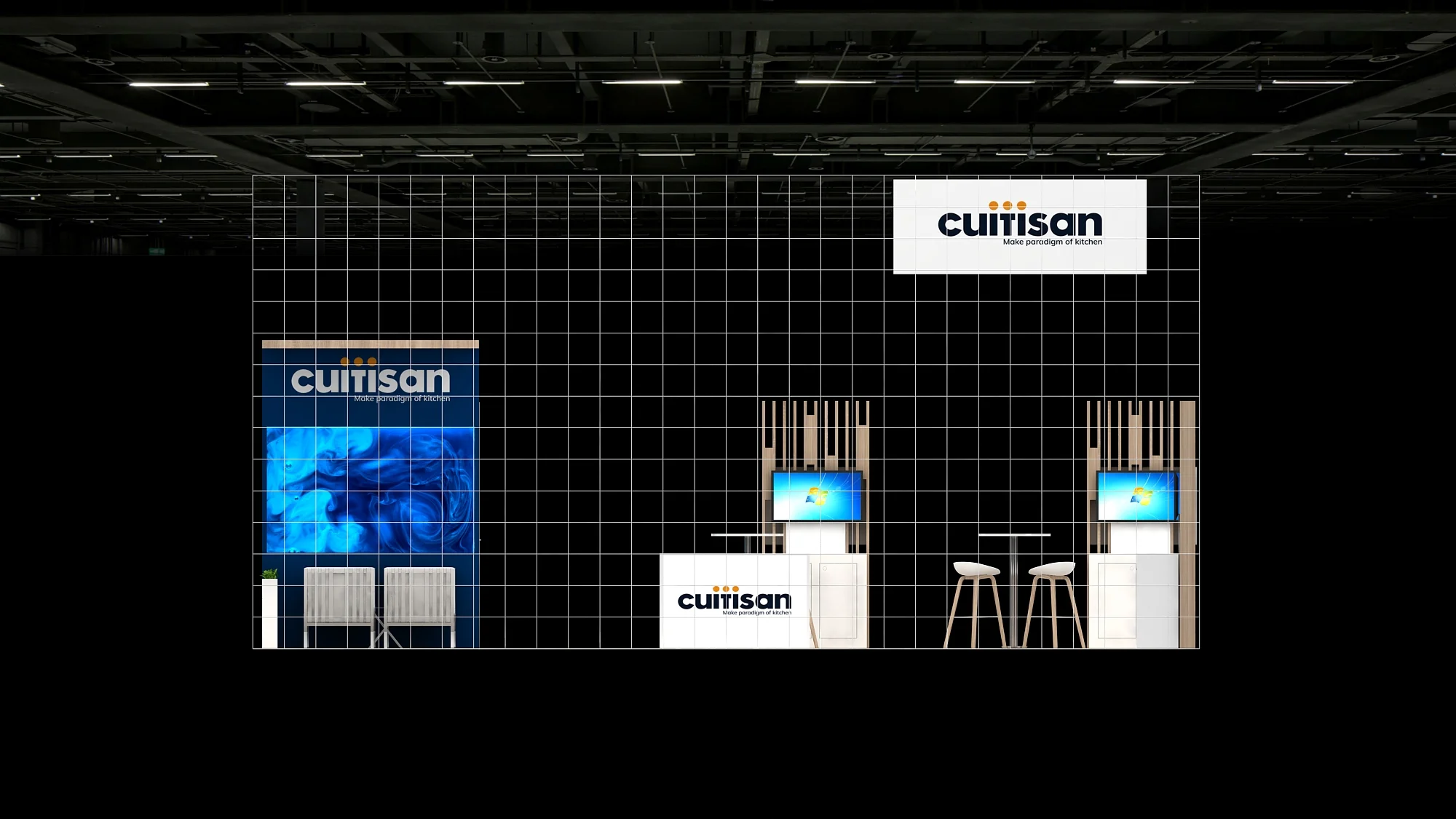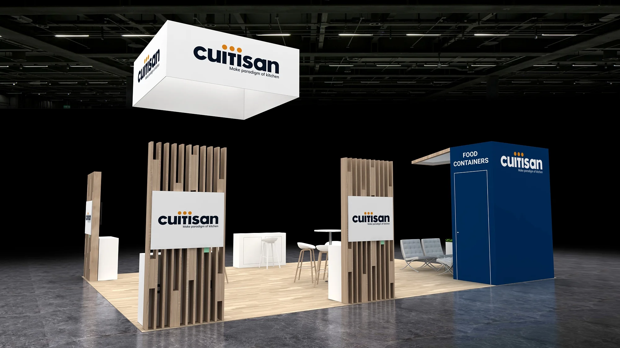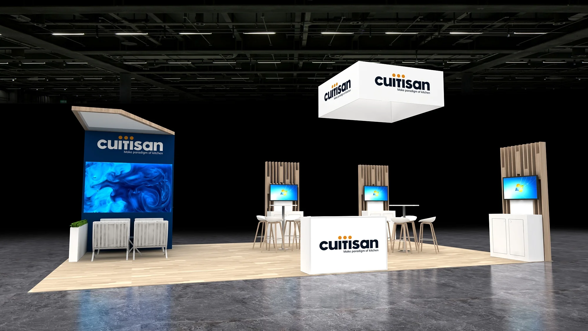This 20x30 exhibit features a large, suspended cube sign and a central, angled structure with wood accents and a vertical graphic. The open floor plan includes twin demo stations with screens, high-top collaboration tables, and a vibrant blue lounge area, all resting on a light wood-effect floor covering.