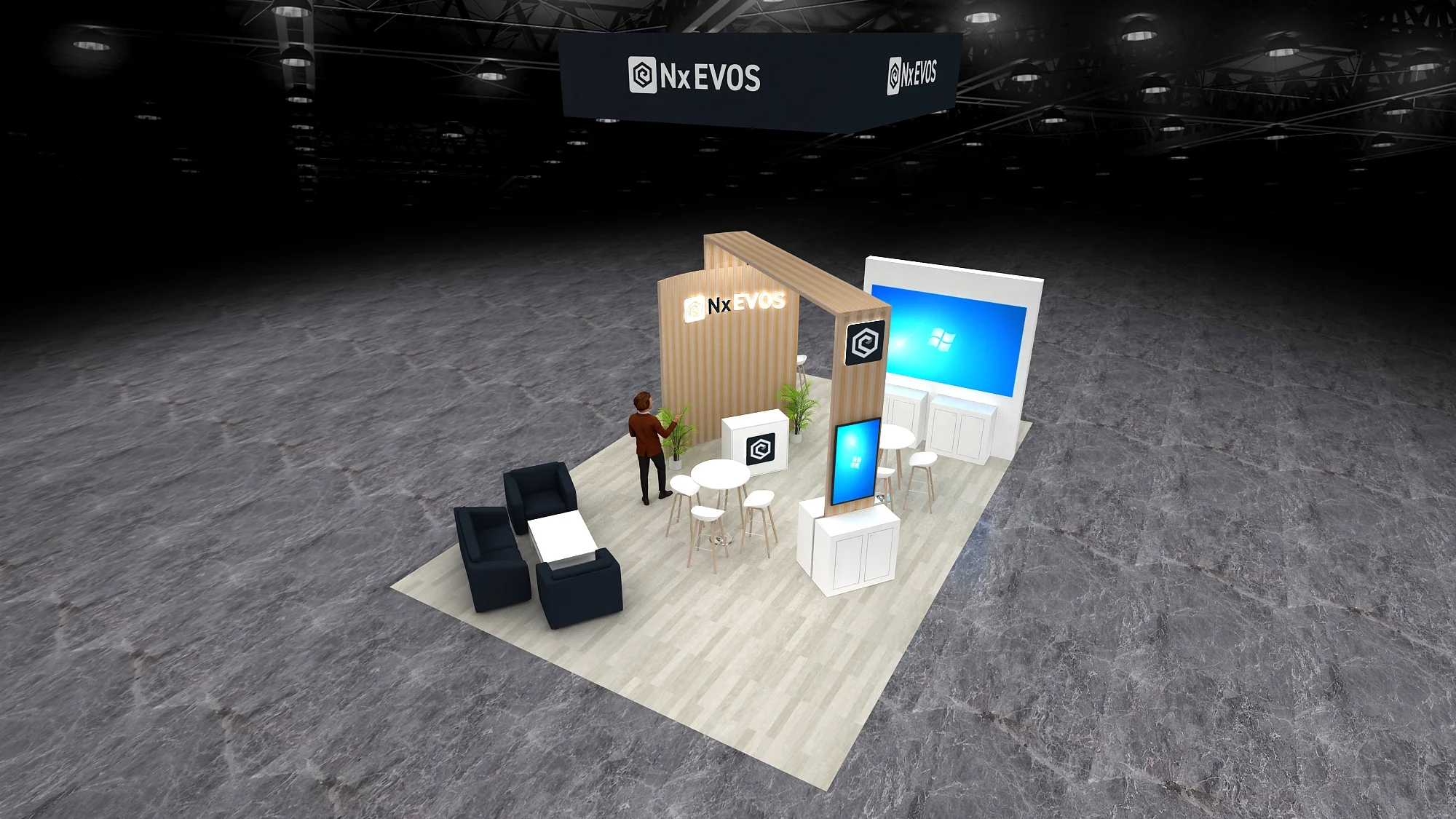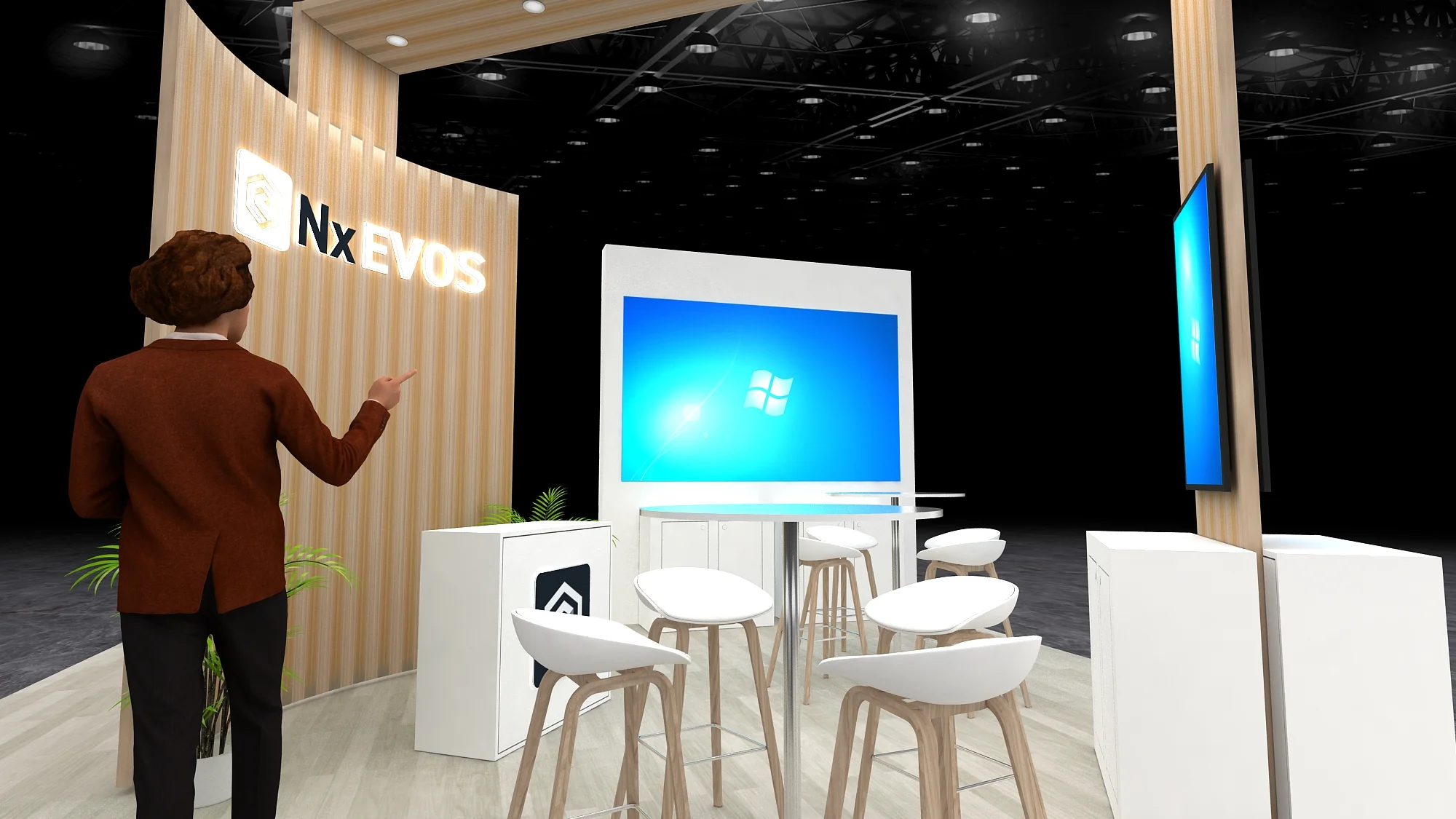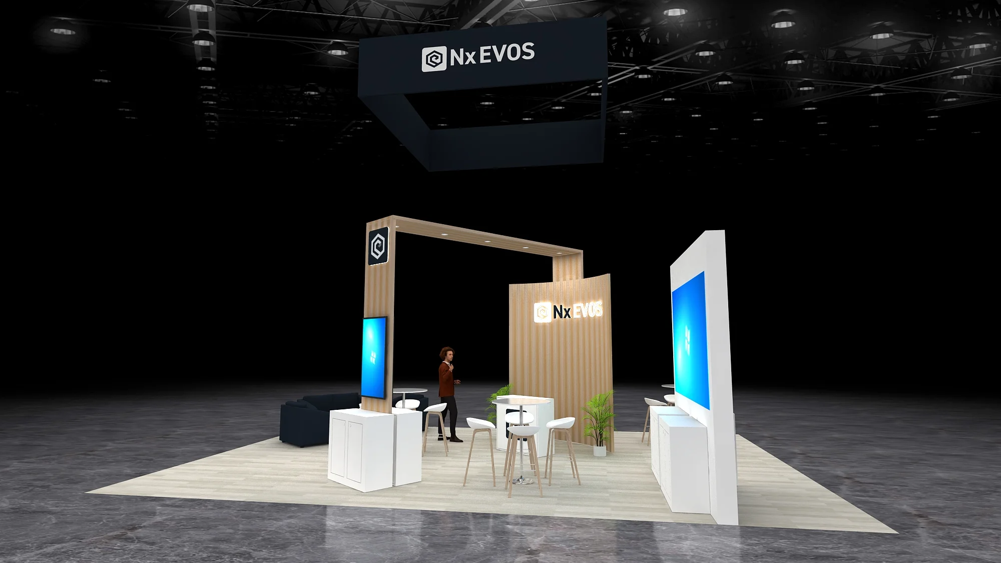 This 20x30 exhibit features prominent dual digital displays for demonstrations and a central branding pylon with integrated monitor. The design incorporates a relaxed lounge area with soft seating, high-top tables with stools, and a distinctive overhead cube structure, all set on a light wood-effect floor.