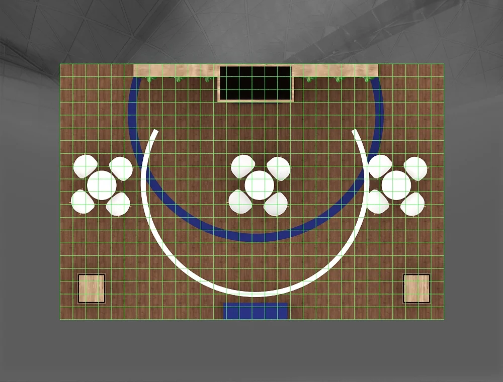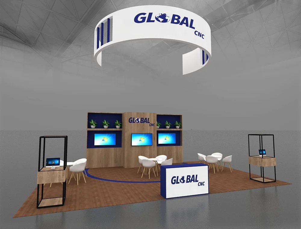 This 20x30 modular island exhibit features a large, C-shaped hanging overhead sign for high-level visibility. The core structure is a central wall with a wood-look finish, integrating two digital monitors and display shelving. Two distinct, low-level seating clusters offer areas for private meetings. The space is completed by a branded reception counter and two open demonstration podiums on the corners.