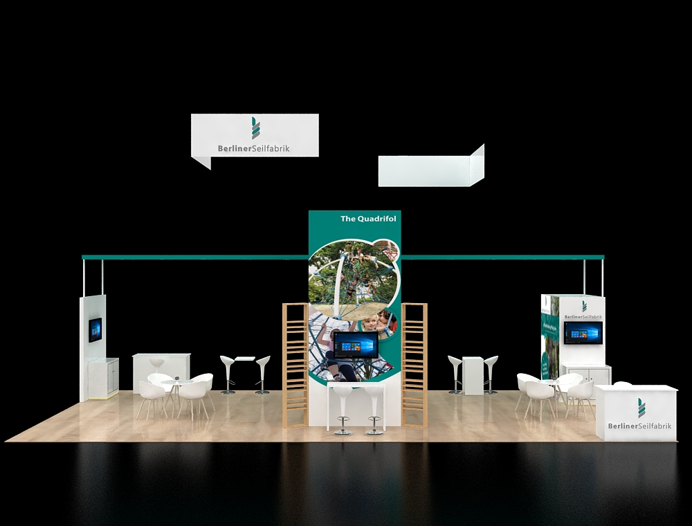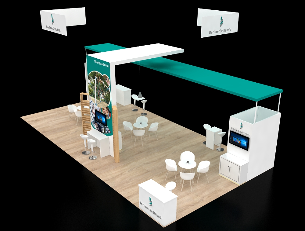 This 20x40 exhibit features a prominent central graphic tower flanked by two product shelving units and integrated screens. The design includes a large, angular overhead sign and a central reception kiosk. The layout is framed by twin high-resolution side kiosks and includes multiple informal white seating clusters, all resting on a light wood-look floor.