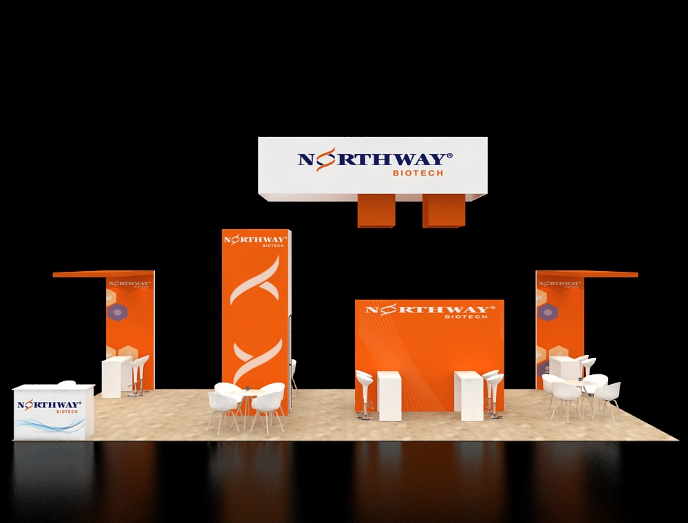 This 20x40 exhibit maximizes visitor flow with an open-front design. It features a continuous graphic back wall with a distinctive curved element, a central high-top counter for standing interaction, and two separate low-profile seating areas. The space is topped by an overhead circular hanging sign and grounded by a dark wood-look floor.