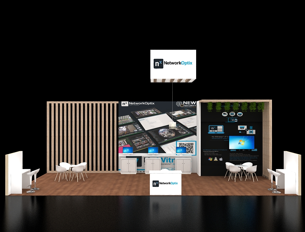 This 20x40 booth features a central graphic backdrop with an overhead suspended sign and is anchored by two distinct seating areas. A prominent vertical slatted wood-look wall defines the left side, while the right includes a section with hanging greenery. A light wood-look floor covers the exhibit space, and a central desk provides an immediate information point.