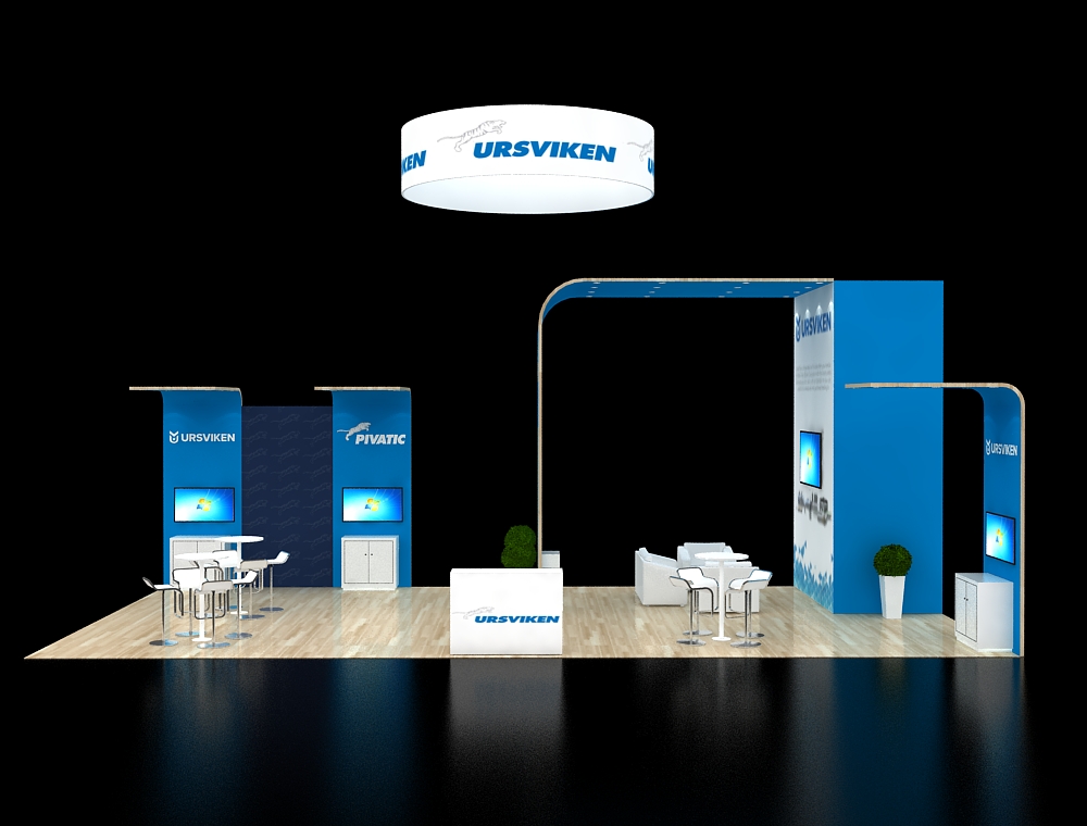 This 20x40 island exhibit features a central graphic pylon displaying one monitor, flanked by two side display kiosks, each with a screen. The stand includes a large, circular overhead sign and two low white seating areas with round tables. Light wood-look flooring and a prominent red carpet runner define the space.
