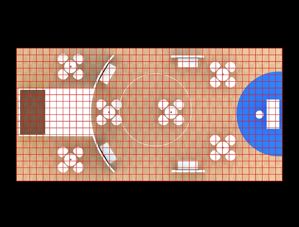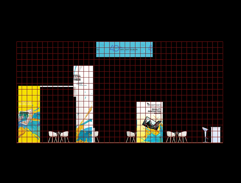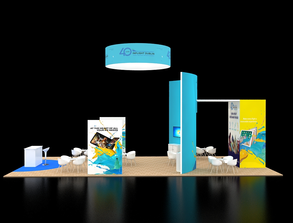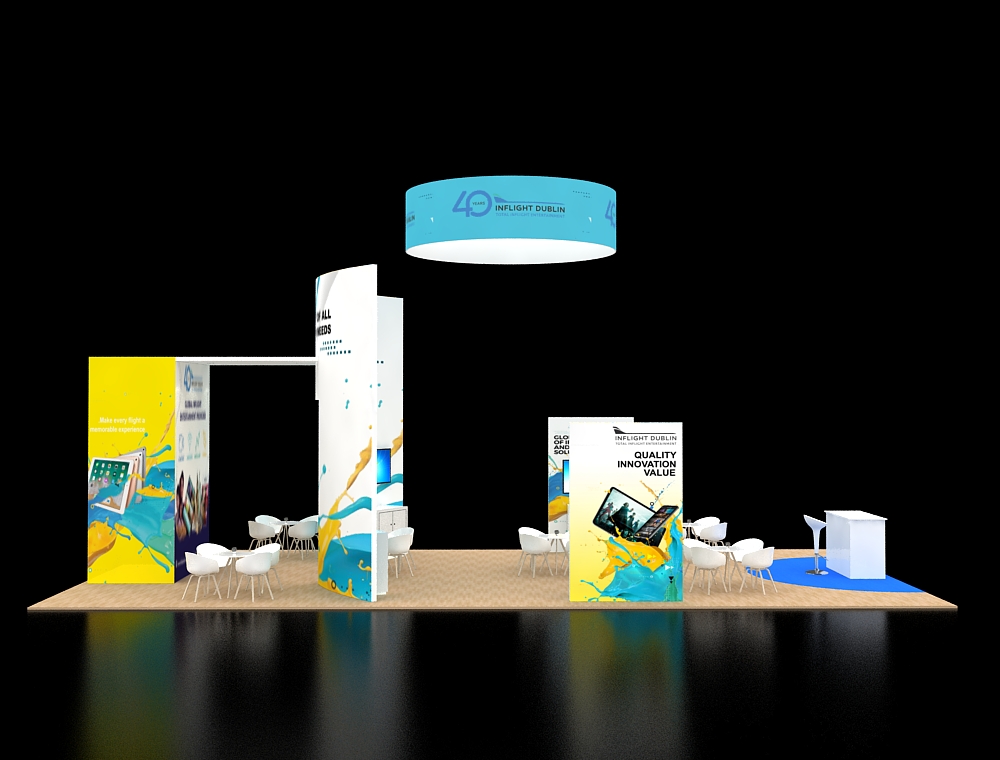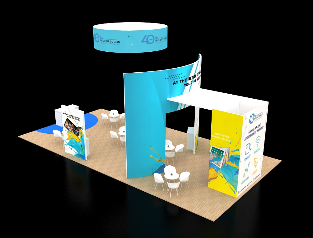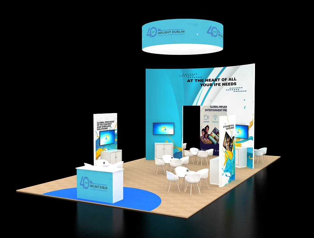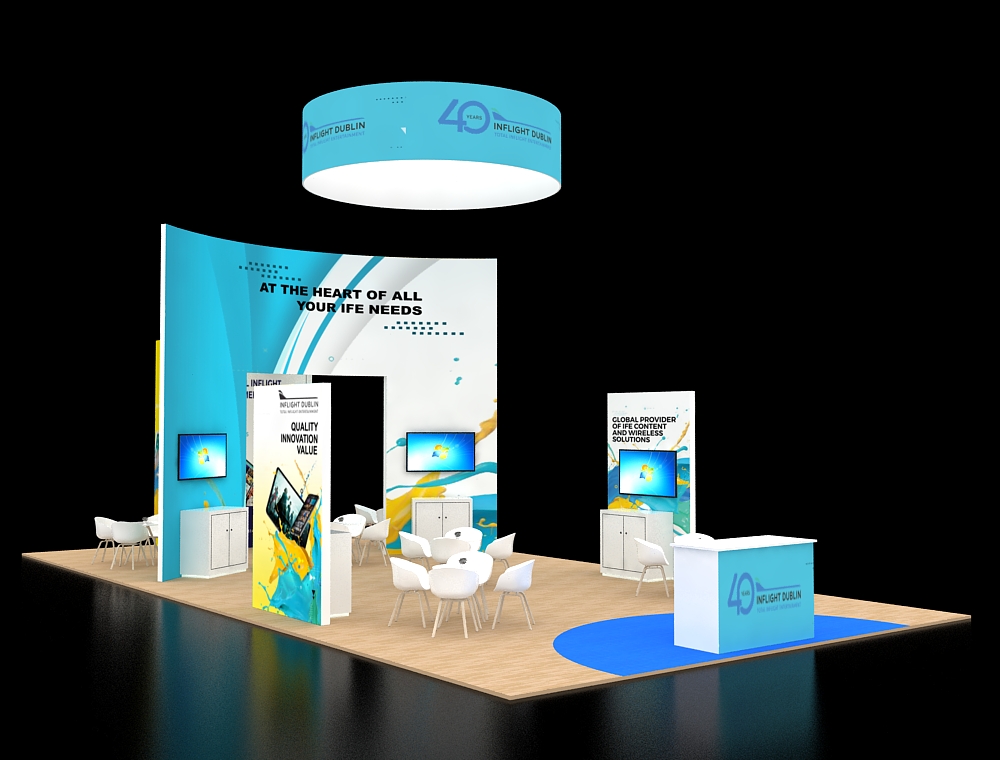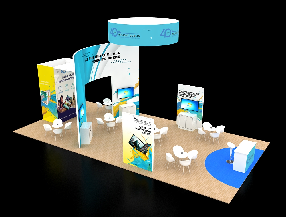 This 20x40 exhibit is structured around a central open archway with a large overhead canopy and a front reception counter. The archway is supported by two tall graphic towers, each with an integrated monitor. A large back graphic wall features one additional monitor and two product display shelves. The floor is light wood-look vinyl with white furniture. There are a total of Four monitors in this display.