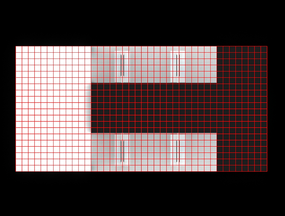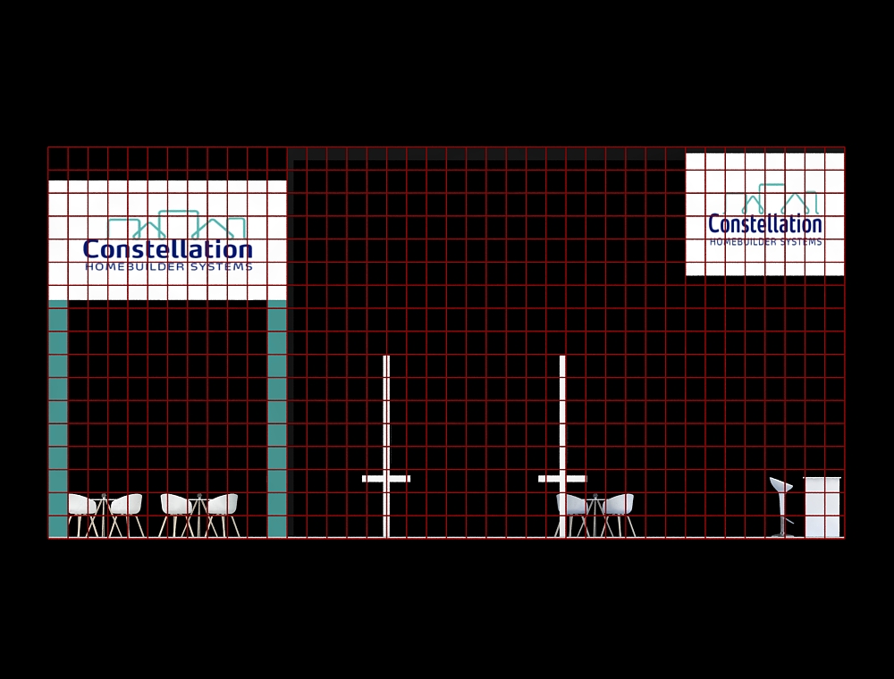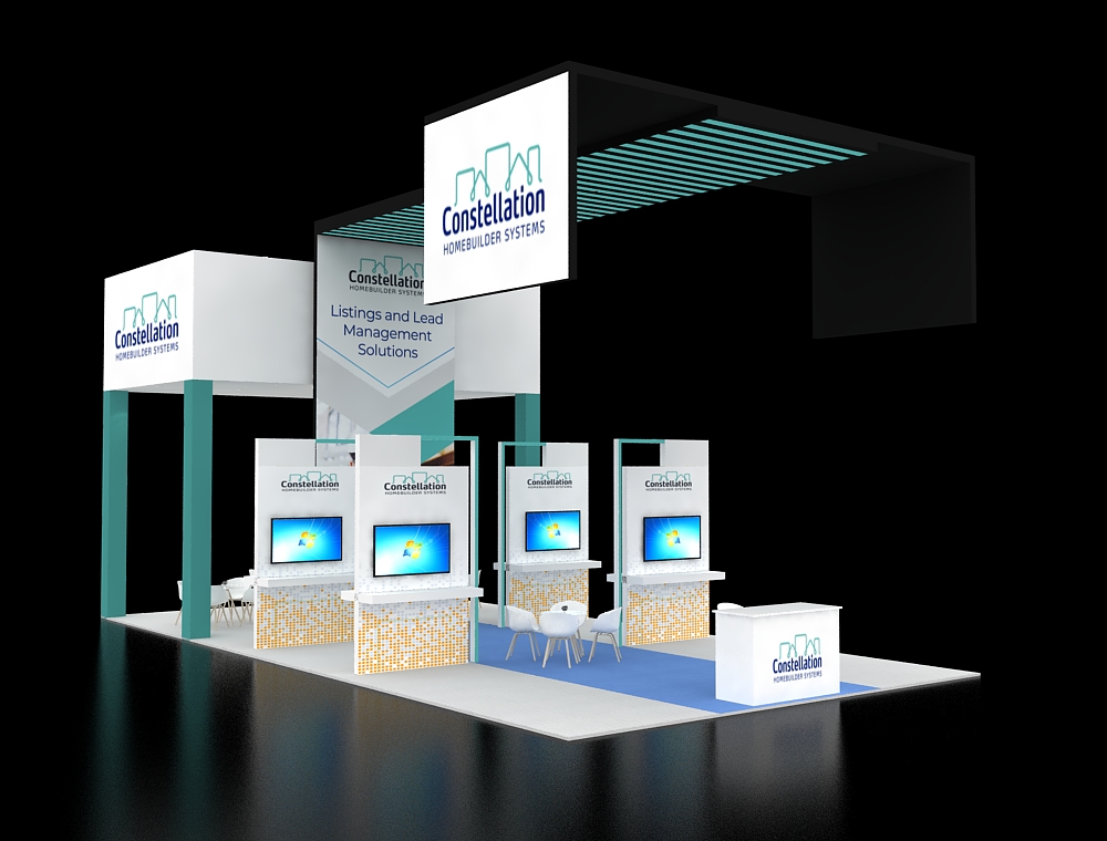 This 20x40 exhibit features a wide open archway with a large overhead rectangular sign. Three monitors are integrated: two on flanking storage/display kiosks and one near the front counter. The design employs a striking black and green graphic theme, with three seating clusters and wood-look flooring defining the space. There are a total of Four monitors in this display.
