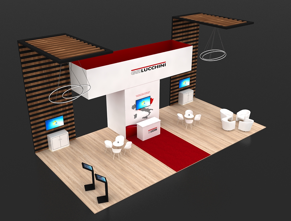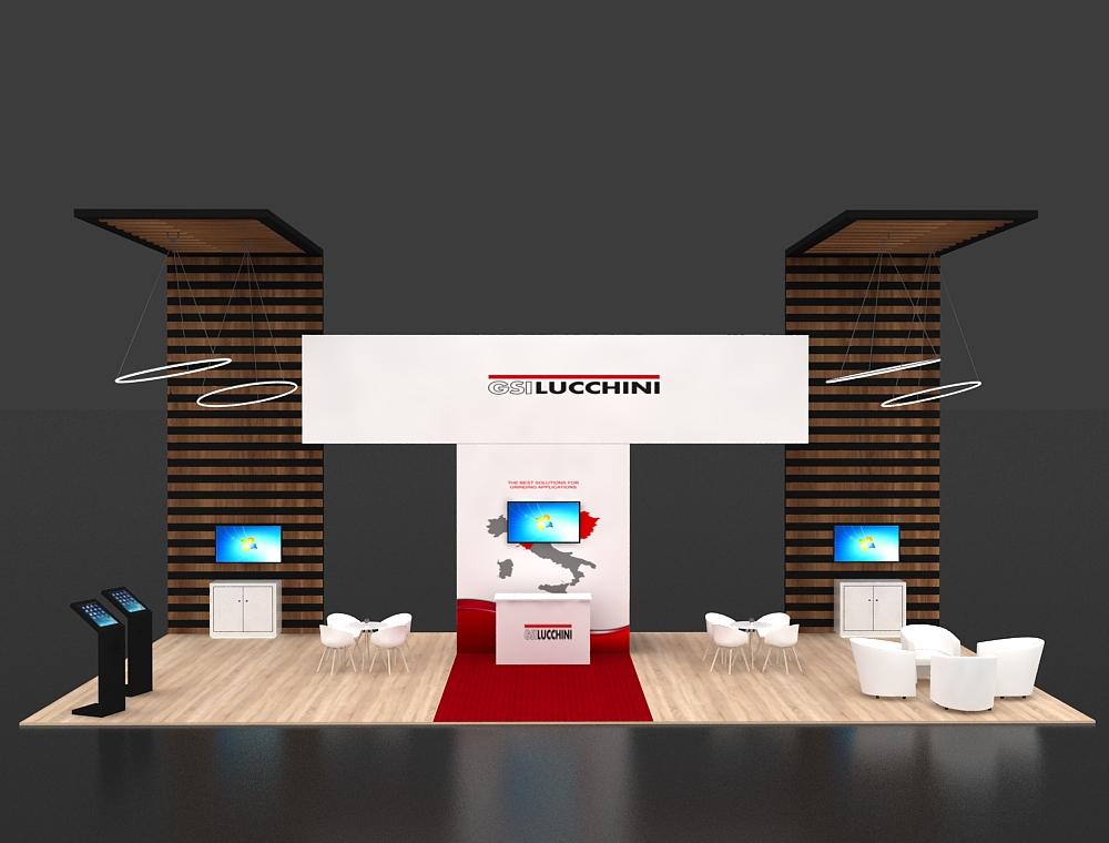 This 20x40 island exhibit features an open arch structure supported by two tall graphic towers. Four monitors are integrated into the design: two on the central back wall and one on each tower's reception counter. A large rectangular overhead sign and multiple white chairs and tables for seating are included. The flooring is a light wood-look finish. There are a total of four monitors in this display.