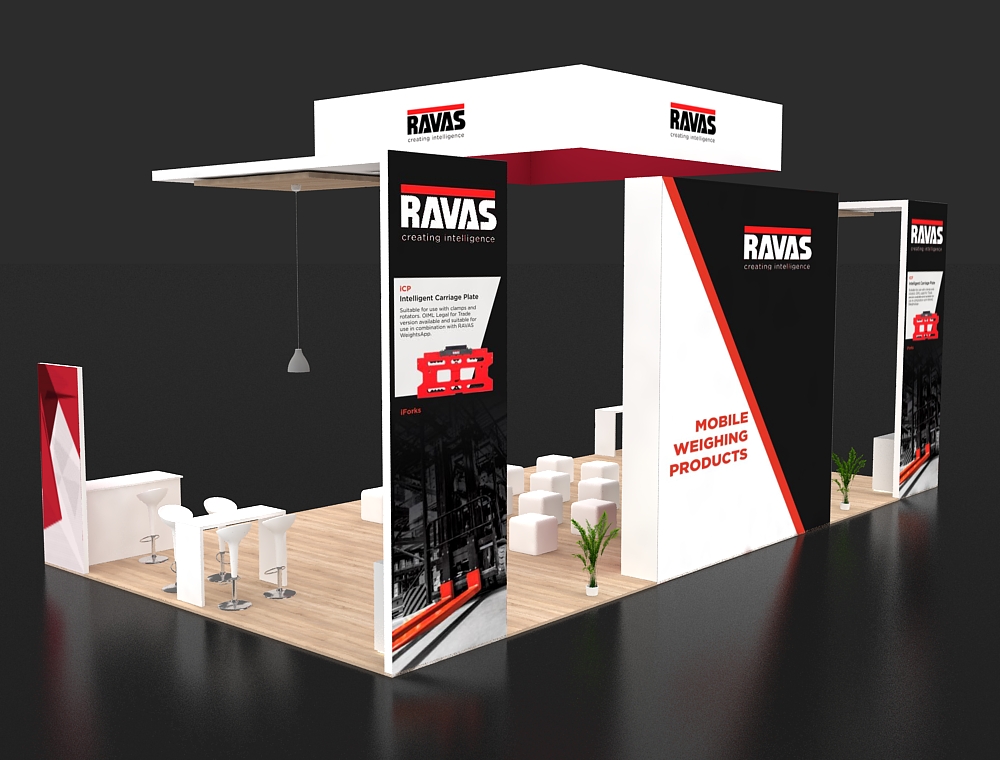 This 20x40 exhibition stand is defined by its strong red and white color scheme and modular towers. A central column displays one monitor, flanked by two side display walls, each featuring two monitors. The stand includes a front reception counter, two curved graphic panels, and two separate informal seating areas. There are a total of five monitors in this display.