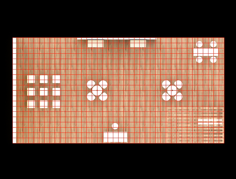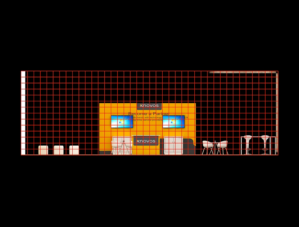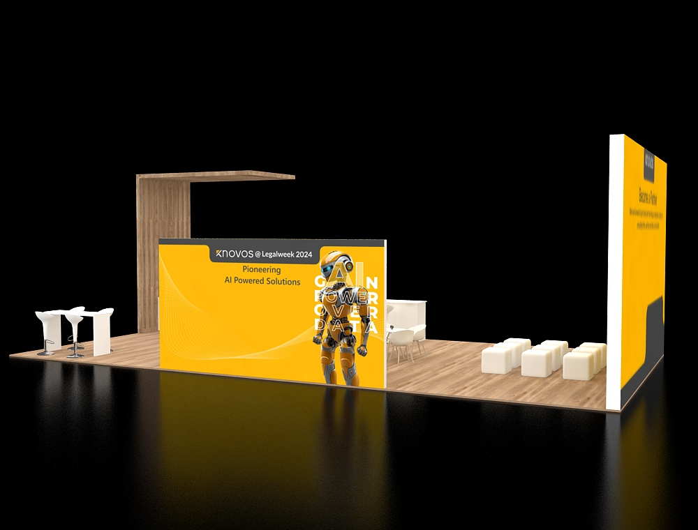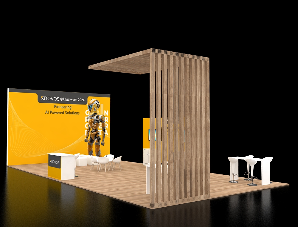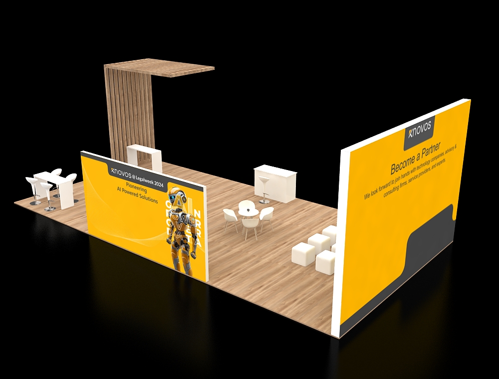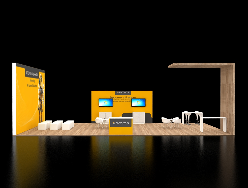 This 20x40 exhibition stand features a prominent central back wall with two integrated monitors and a front reception counter. The space is defined by light wood-look flooring and includes two distinct seating areas: one with white ottomans and another with white tables and chairs. A decorative vertical wood slat partition and a large vertical graphic wall frame the left side. There are two monitors in this display.