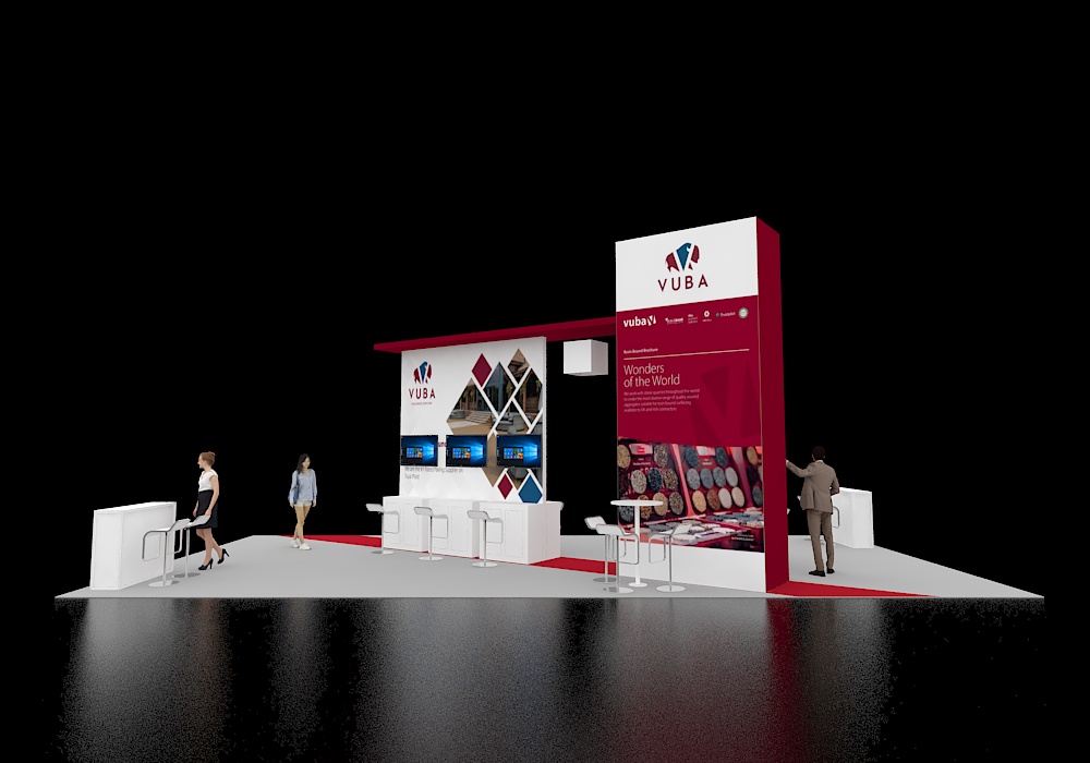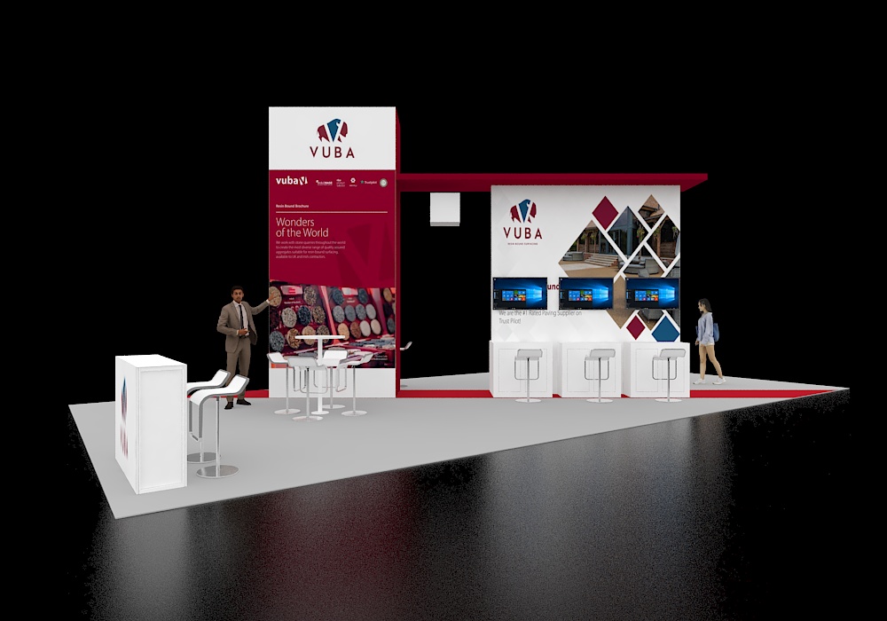 This 20x40 exhibit features a prominent central tower with a large monitor, flanked by two side display stations, each with a screen. An oversized rectangular overhead sign provides high visibility. The design utilizes striking red vertical accent strips and includes two intimate white seating arrangements for visitor discussions, complemented by a small reception counter. There are a total of three monitors in this display.