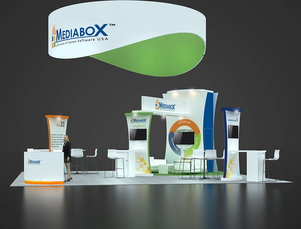 This 30x30 floor plan is anchored by a large white overhead canopy featuring blue interior accents. Two tall primary pillars house digital displays and integrated shelving for high-impact visual engagement. The layout includes a central lounge with white modular seating, complemented by side meeting areas with high tables and stools to facilitate professional networking.