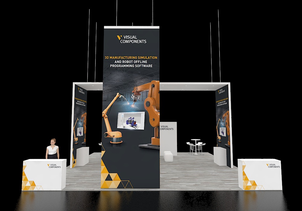 This exhibit features a central white archway connecting a slatted wood pergola on the left. The layout includes three freestanding interactive kiosks and low, curved white lounge seating centered on a red rug. A built-in presentation wall features a video display, and the booth utilizes a light wood floor with a red and white color scheme.