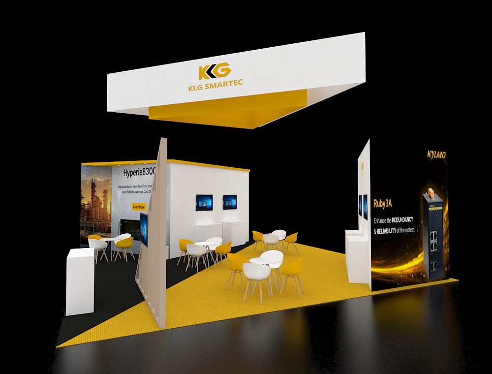 This 30x30 booth is characterized by a dominant yellow graphic wall and a textured wood-slat structural element. It features a dedicated presentation area with modular white seating cubes and a high-top meeting counter. The design includes integrated video displays on the back wall and a freestanding reception desk, all set on a light wood-look floor.