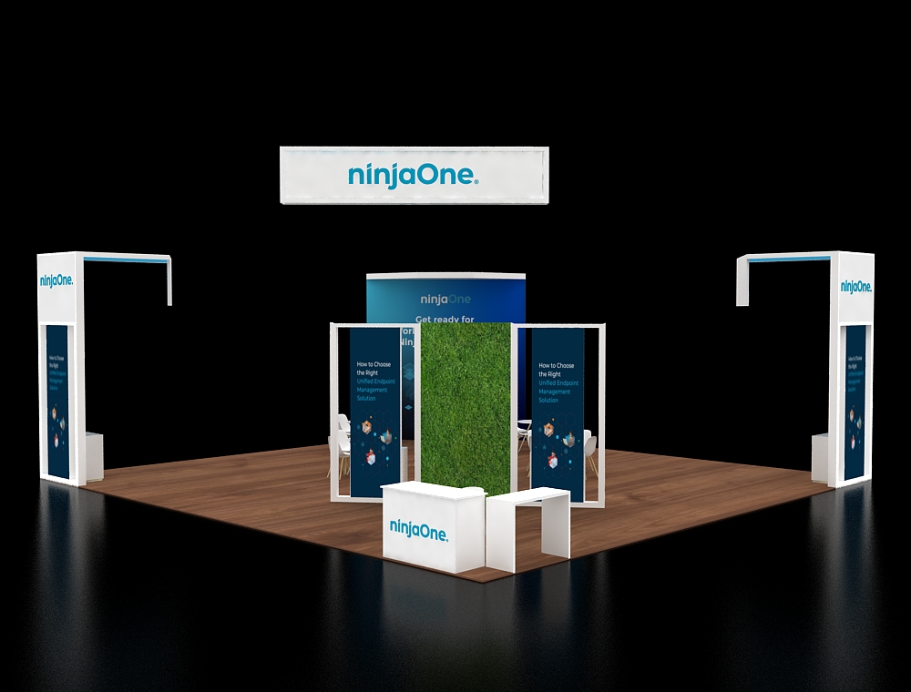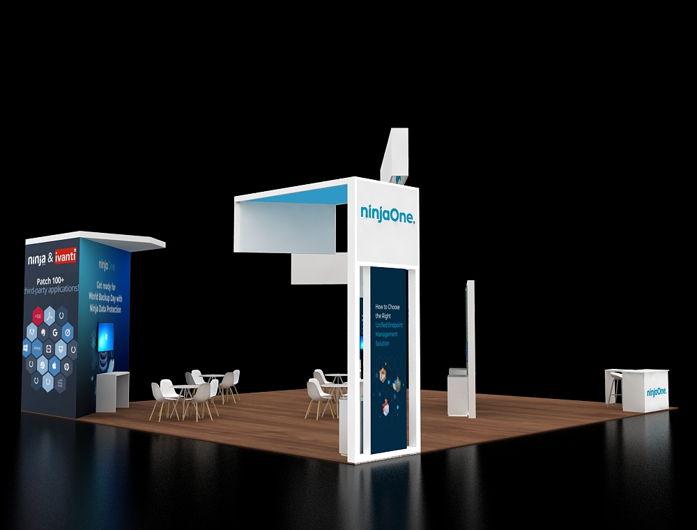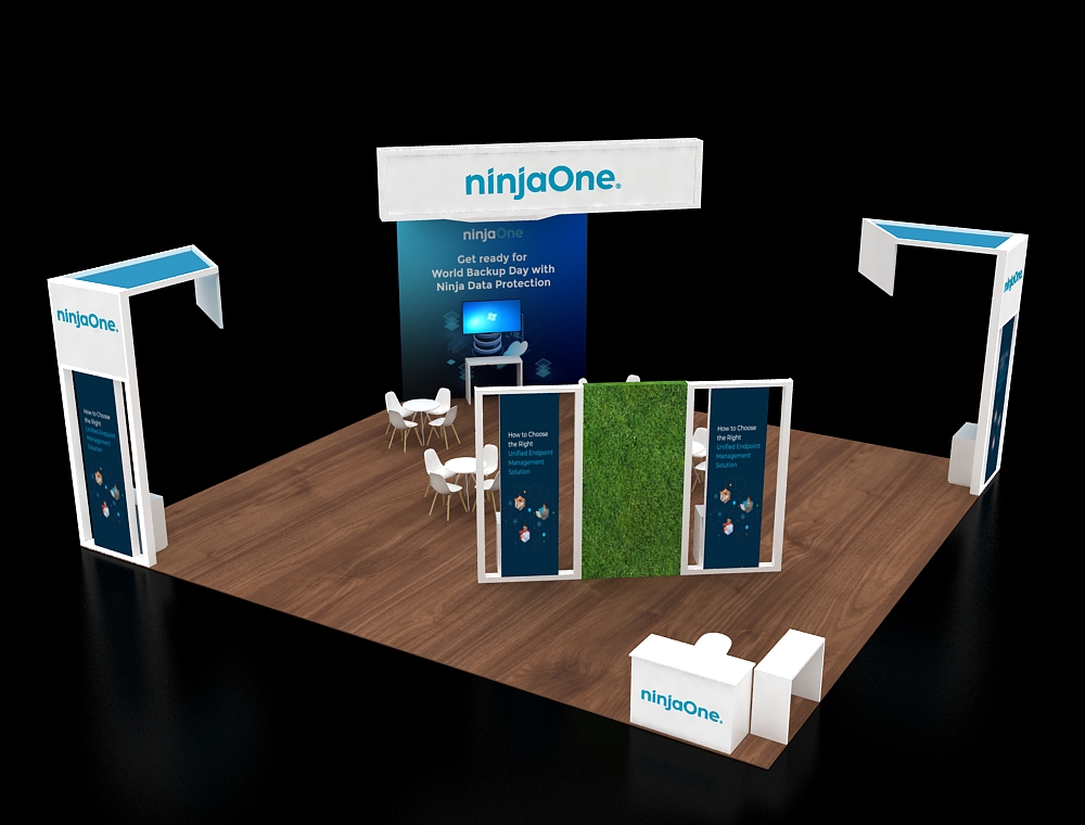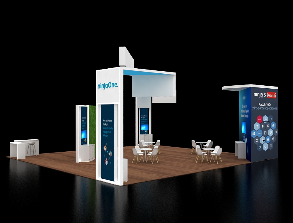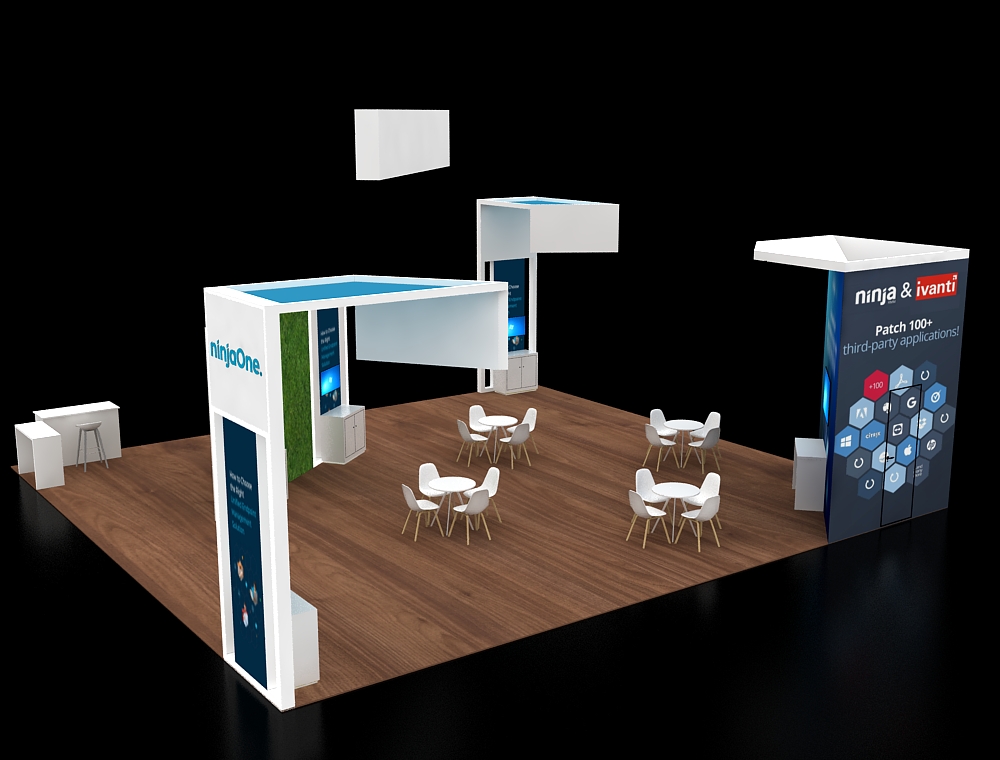 This exhibit features a striking central entrance archway and a wood-slat structural element with pendant lights. The layout includes three freestanding interactive kiosks and a low-profile lounge seating area on a red accent rug. A built-in video presentation wall completes the design, which utilizes a light wood-look floor finish.