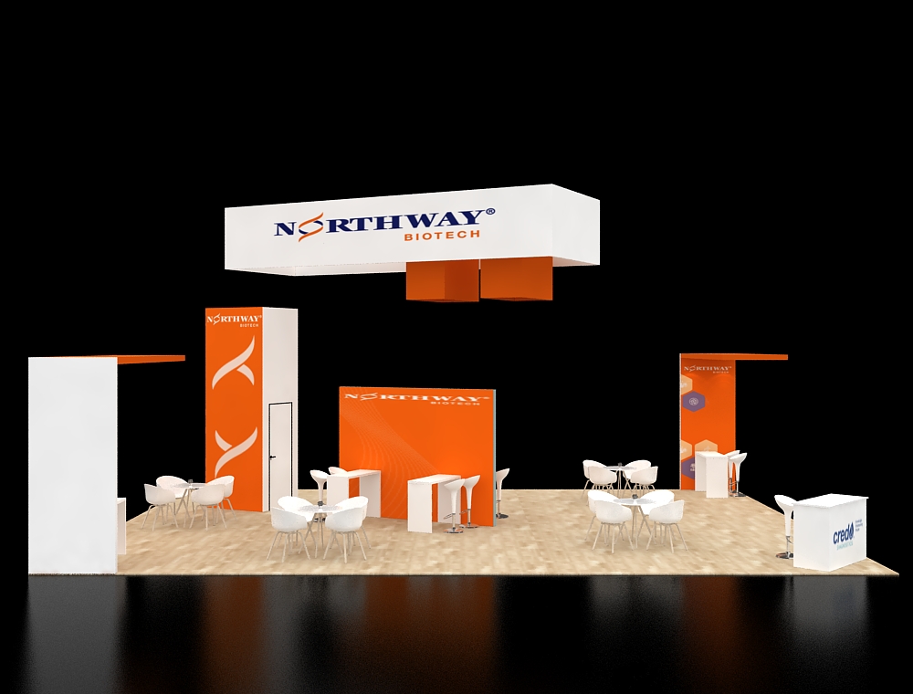 This 30x40 open-concept display features a prominent multi-tiered hanging banner and several tall architectural towers. The layout is optimized for networking, incorporating multiple café-style seating clusters and high-top demo stations. A light wood-textured floor ties the space together, while integrated lighting under the overhangs ensures a bright environment for visitor engagement and professional presentations.