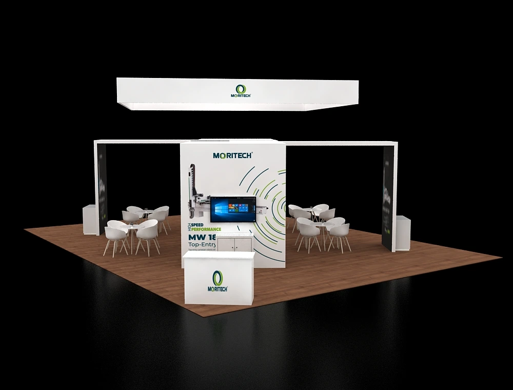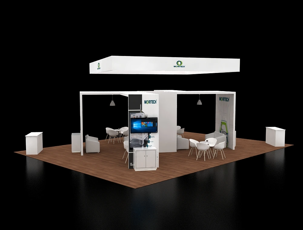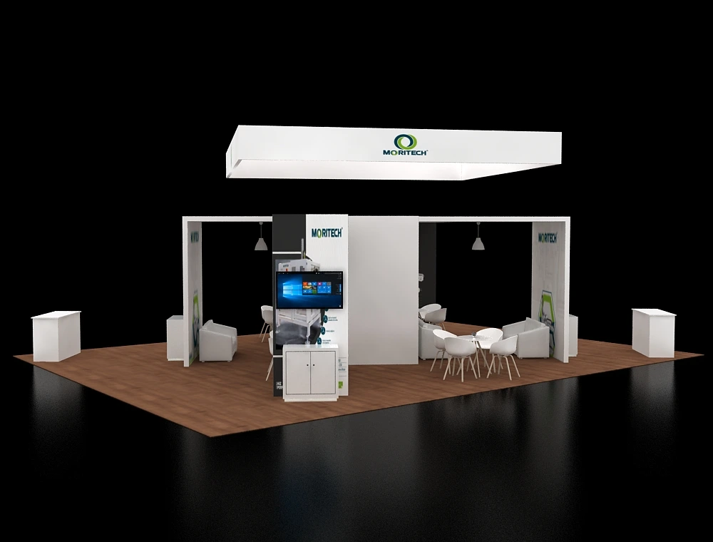 This 30x40 exhibit footprint is defined by a massive overhead square branding banner that ensures high-level visibility across the hall. Two towering side pillars flank an expansive central graphic wall, creating a primary visual anchor for the space. The layout incorporates a front-facing welcome counter, multiple seating clusters for networking, and integrated digital display panels set into the architectural pillars.