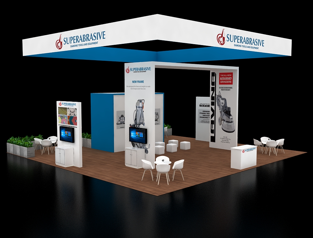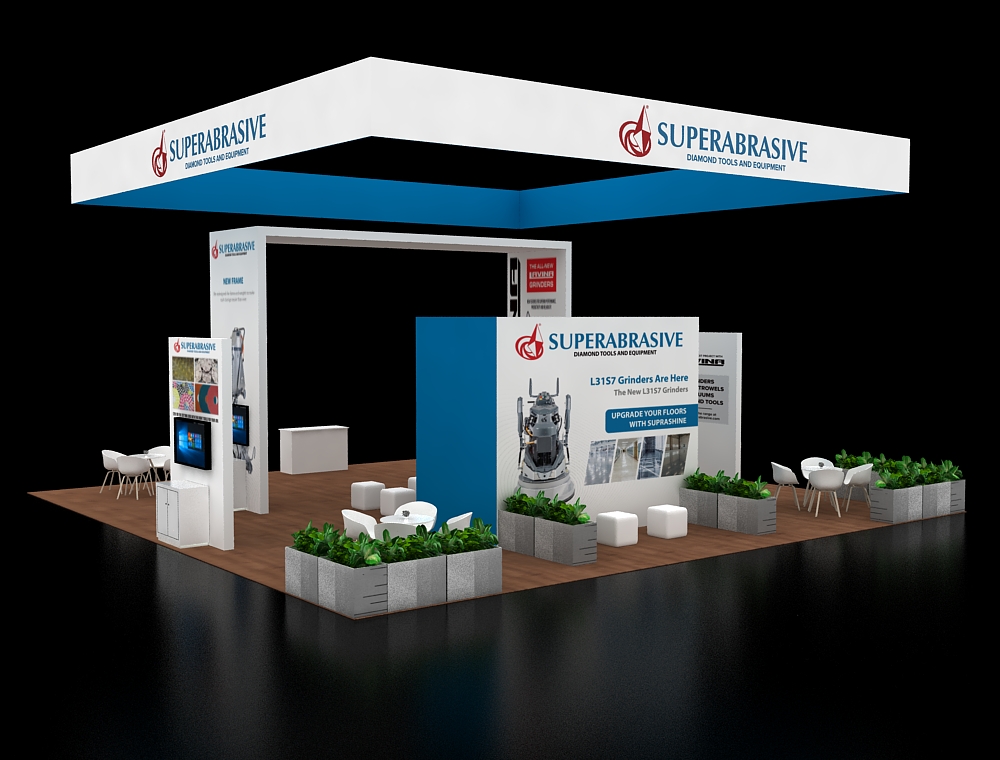 This 40x40 professional layout is defined by a prominent tapered overhead banner and rich wood-textured flooring. The architecture includes a tall L-shaped structural beam on the left and a centralized graphic backdrop. Functionality is maximized through two elongated high-top counters with stools, two circular meeting sets, and a standalone reception desk positioned at the very front.