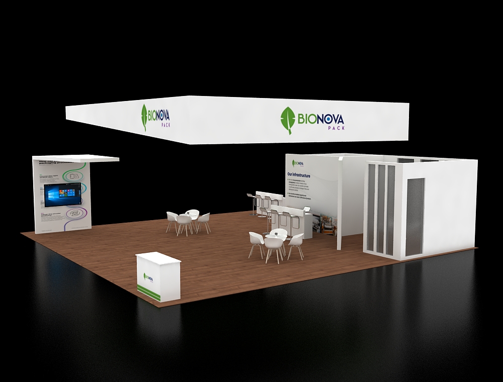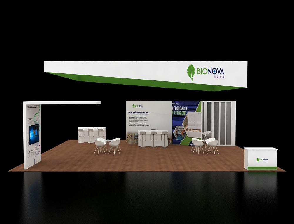 This 40x40 exhibit layout features a prominent suspended canopy and wood-textured floor covering. The space integrates two high-top counters for professional interaction and separate meeting areas for discussions. Large graphic walls provide ample space for messaging, while a front reception stand greets visitors. Its open perimeter ensures seamless movement for attendees within the structured environment.