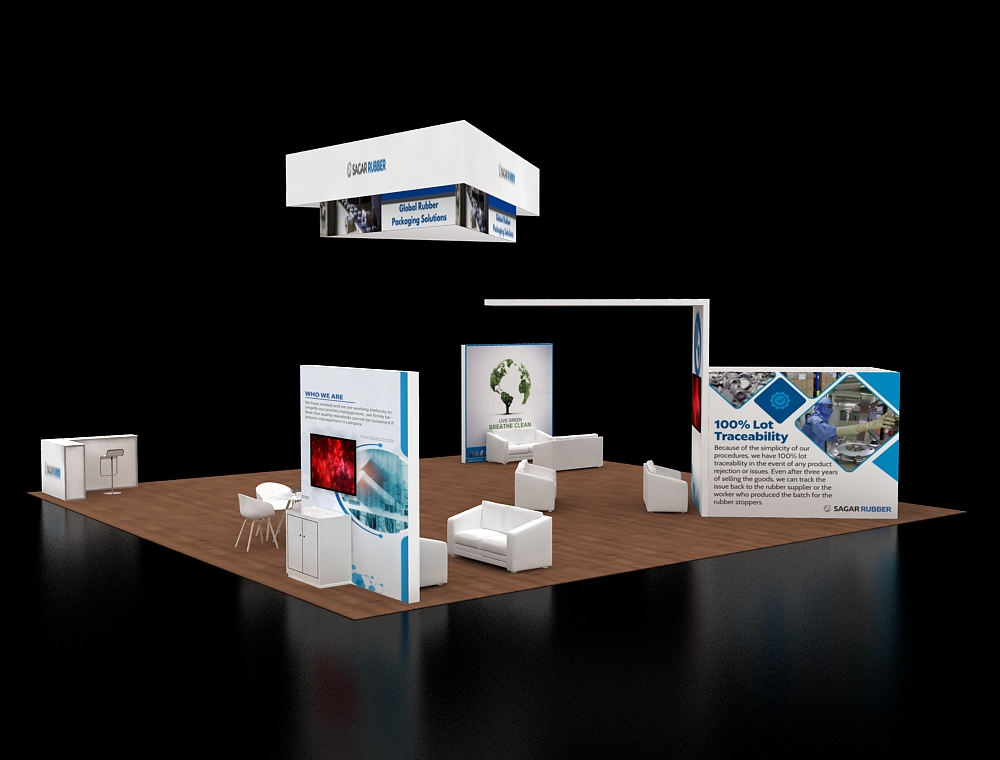 This 40x40 island layout features a substantial white rectangular box canopy and a warm wood-textured floor. Architectural interest is generated by vertical timber slat dividers that house integrated digital media stations. The floor plan incorporates a clean reception counter at the perimeter, central graphic pillar walls, and multiple consultation zones furnished with modern white seating and potted greenery.